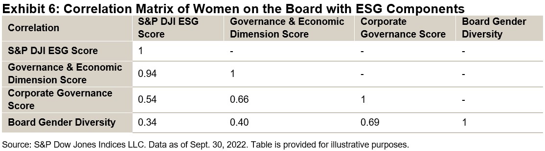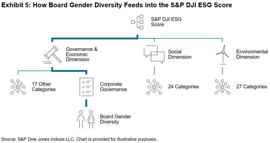 Board Gender Diversity forms a part of the Corporate Governance Score, a component of the broader S&P Governance and Economic Dimension Score—the “G” in the S&P DJI ESG Score,9 as reflected in Exhibit 5.
