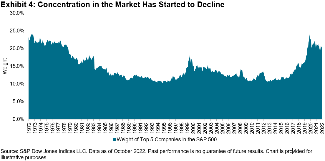 A natural outcome of the outperformance of the S&P 500 Equal Weight Index is that concentration levels in the market have begun to decline, as we observe in Exhibit 4. This is not surprising given the inverse relationship between concentration and equal weighting.
