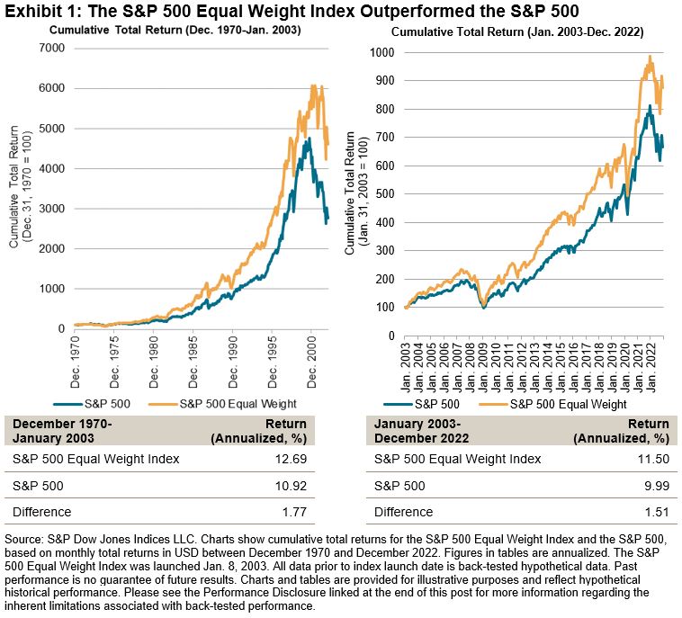 The S&P 500® Equal Weight Index launched on Jan. 8, 2003, so Sunday marked 20 years since the index first allowed investors to measure the performance of egalitarian allocations among S&P 500 constituents. The index is now tracked by various investment products globally, and it has potential benchmarking applications. Exhibit 1 shows that the S&P 500 Equal Weight Index has outperformed the S&P 500, both since January 2003 and when observing its back-tested history starting in the 1970s.