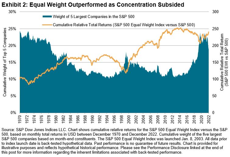 Arguably the biggest driver of the S&P 500 Equal Weight Index’s outperformance was its smaller size exposure. Having more (less) exposure to the smaller (larger) names in the S&P 500 explained over 50% of the S&P 500 Equal Weight Index’s relative returns, historically, and it was useful when exploring equal weight’s impact on risk/return. Indeed, it helped to explain the case for equal weight indexing amid the elevated concentration in S&P 500 constituents in recent years. Exhibit 2 illustrates the historical dynamic between changes in concentration and the relative performance of the equal weight index.