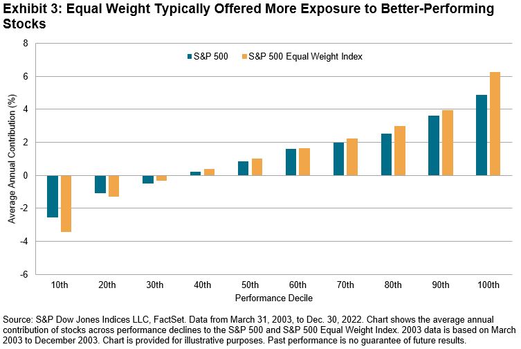 However, size exposure was far from the only source of outperformance in equal weight indices. For example, the S&P 500 Equal Weight Index’s anti-momentum and value factor tilts, along with its distinct sector exposures, helped it to beat the S&P 500 by 7% in 2022. More strategically, the equal weight index benefited from positively skewed equity returns: Exhibit 3 shows that for an average calendar year between 2003 and 2022, the index offered more exposure to the best-performing S&P 500 stocks.