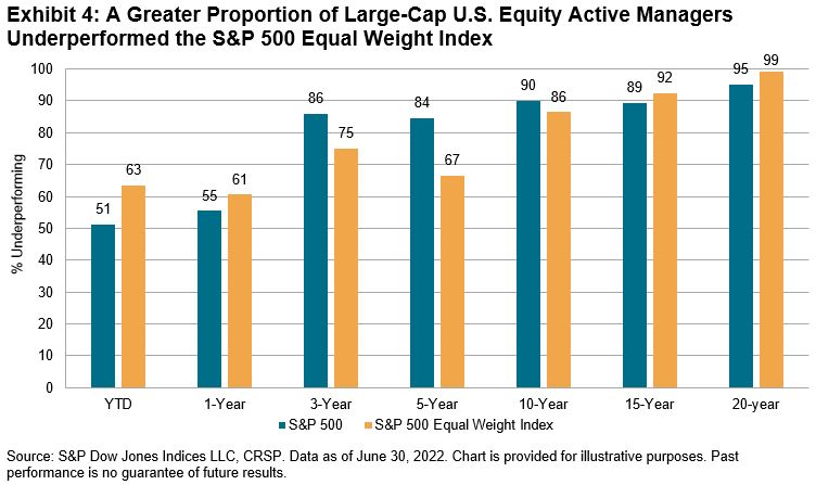 In addition to the potential relevance of the S&P 500 Equal Weight Index to those looking for large-cap U.S. equity exposure, there are several reasons why investors may wish to use the S&P 500 Equal Weight Index as a supplemental benchmark for large-cap U.S. equity managers. For example, the equal weight index may be a more suitable benchmark, given that it appears many active managers have historically been closer to equal weighting than cap weighting in their portfolio construction. Exhibit 4 illustrates that the S&P 500 Equal Weight Index set a higher standard for large-cap U.S. equity active managers to beat over various horizons ending June 30, 2022.