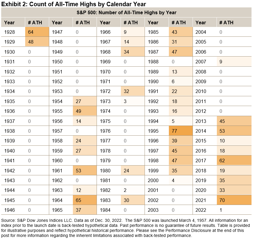 A tumultuous 2022 resulted in the S&P 500 entering a bear market and posting its worst calendar year performance since 2008, down 18%, bringing an end to its three-year winning streak. The picture could have been grimmer had it not been for an early rally in October and November; the S&P 500 was down more than 25% at its worst point. Exhibit 1 shows that the S&P 500’s reached only one all-time high during 2022 (on Jan. 3), the fewest all-time highs in a year since 2012.