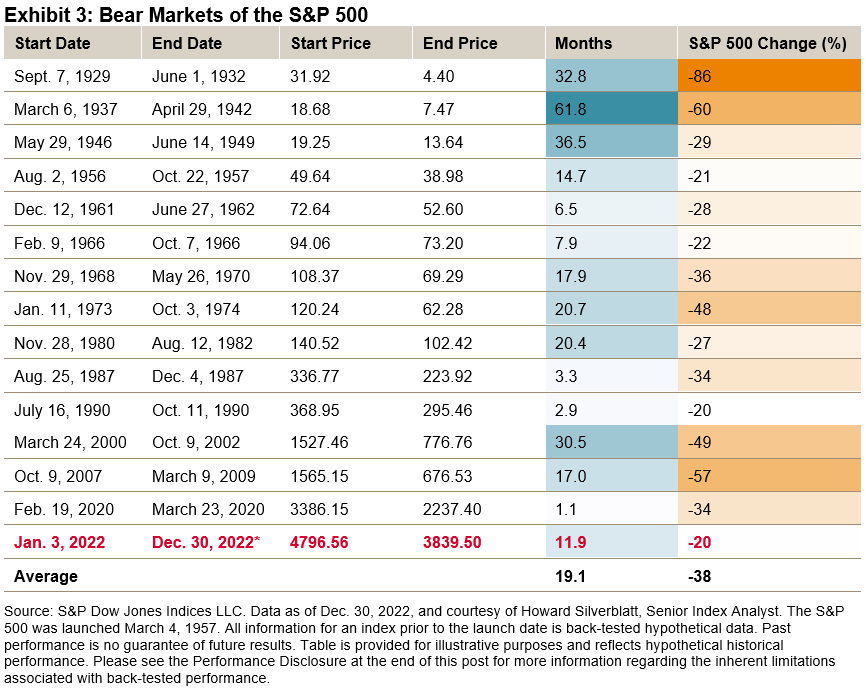 Overall, the S&P 500’s 14 bear markets since 1928 lasted an average of 19 months and were accompanied by an average peak-to-trough performance of -38% (see Exhibit 3).
