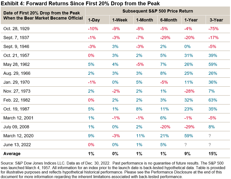 However, market participants can take one silver lining from history—the S&P 500 has typically rebounded from major drops over medium horizons. For example, Exhibit 4 shows that the S&P 500 gained an average of 15% over the three-year period following the beginning of a bear market, and the index typically exhibited a positive return. While history shows the importance of treading with caution in bear markets, a friendly reminder is that at the end of every bear market, a bull market begins and all things pass in time.