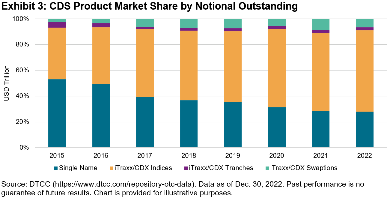 Increasingly, investors are looking for income through index-tracking funds. In January alone, more than USD 25 billion flowed into U.S.-listed fixed income ETFs. While large institutions have traditionally allocated to bonds, retail investors have changed how they allocate to fixed income, with an increasing preference for funds. Focusing on U.S. households, both the share (see Exhibit 1) and total value of assets held in fixed income funds (see Exhibit 2) are larger than individual bond purchases. As a larger percentage of the population enters retirement age, the need for a fixed stream of income would appear to be greater. Federal Reserve data has shown that this has not been the case. Baby Boomers started to enter retirement age in the last decade and are expected to continue through this decade. During that time, U.S. households’ total share of fixed income (both direct bond purchases and purchases through funds) shrank. This contrasts with the equity market, where the total share of equities held has risen from 28% to 35% since 2010.