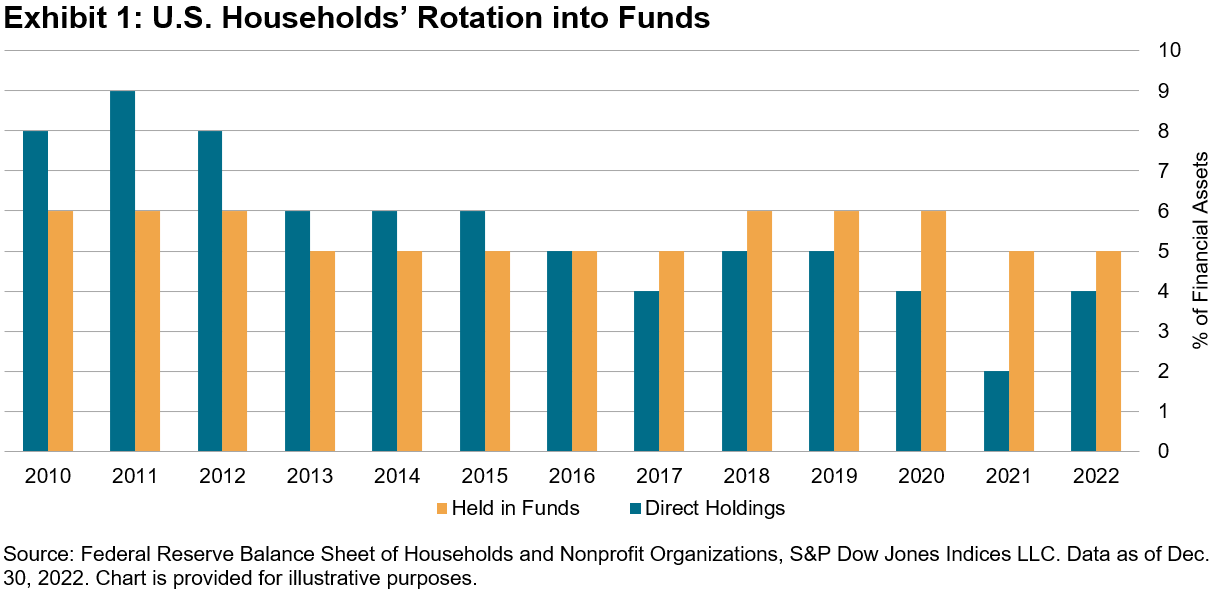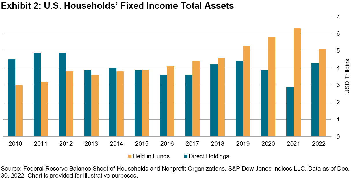 Increasingly, investors are looking for income through index-tracking funds. In January alone, more than USD 25 billion flowed into U.S.-listed fixed income ETFs. While large institutions have traditionally allocated to bonds, retail investors have changed how they allocate to fixed income, with an increasing preference for funds. Focusing on U.S. households, both the share (see Exhibit 1) and total value of assets held in fixed income funds (see Exhibit 2) are larger than individual bond purchases. As a larger percentage of the population enters retirement age, the need for a fixed stream of income would appear to be greater. Federal Reserve data has shown that this has not been the case. Baby Boomers started to enter retirement age in the last decade and are expected to continue through this decade. During that time, U.S. households’ total share of fixed income (both direct bond purchases and purchases through funds) shrank. This contrasts with the equity market, where the total share of equities held has risen from 28% to 35% since 2010.