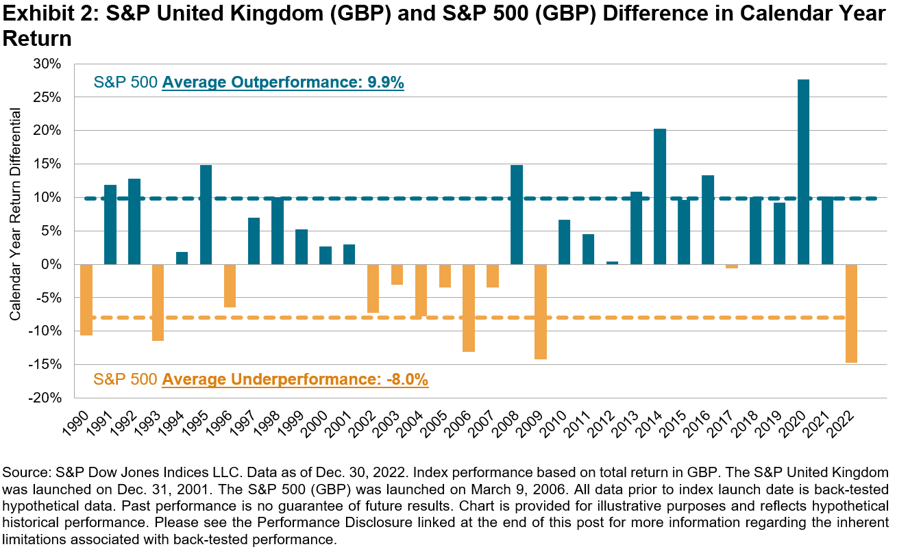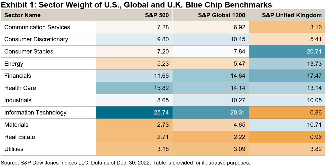 Moreover, the U.K. has more significant over- and underweights than the S&P 500 relative to a global benchmark. Exhibit 1 compares the sector weights of the S&P 500 and S&P United Kingdom versus the S&P Global 1200. The S&P United Kingdom had larger sector weights than the S&P Global 1200 in Consumer Staples, Energy and Materials, and a far lower weight in Information Technology. On the other hand, the S&P 500 was overweight IT and Communication Services. Hence, incorporating U.S. equities could help a U.K. investor alleviate domestic sector biases by providing exposure to different sectors.