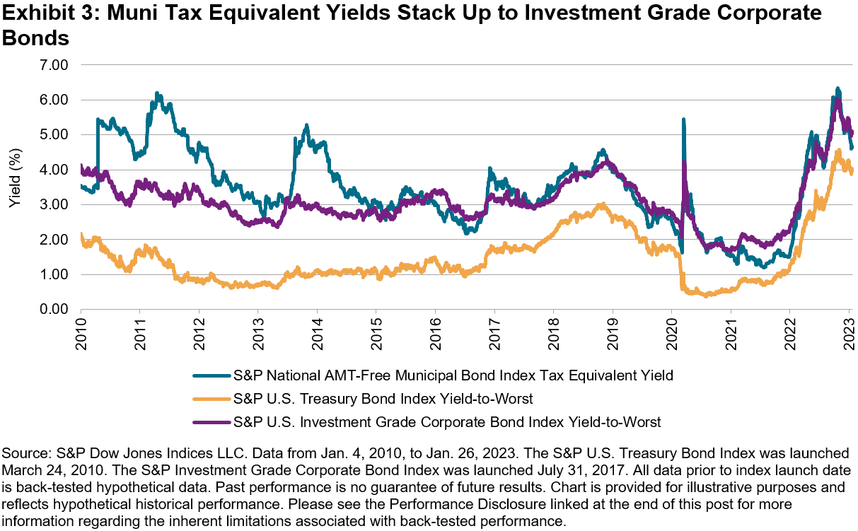 The current tax equivalent yield on the S&P National AMT-Free Municipal Bond Index is 4.63%. Taking tax benefits into account puts municipal bonds on equal footing with other taxable fixed income sectors like treasuries and corporate bonds. U.S. Treasury yields fall short of that, at 4%, while corporate bonds currently exceed 5% (see Exhibit 3). Those incremental 37 bps do come with credit risk, however, as the average rating for the municipal index is AA, compared with A- for the corporate index.