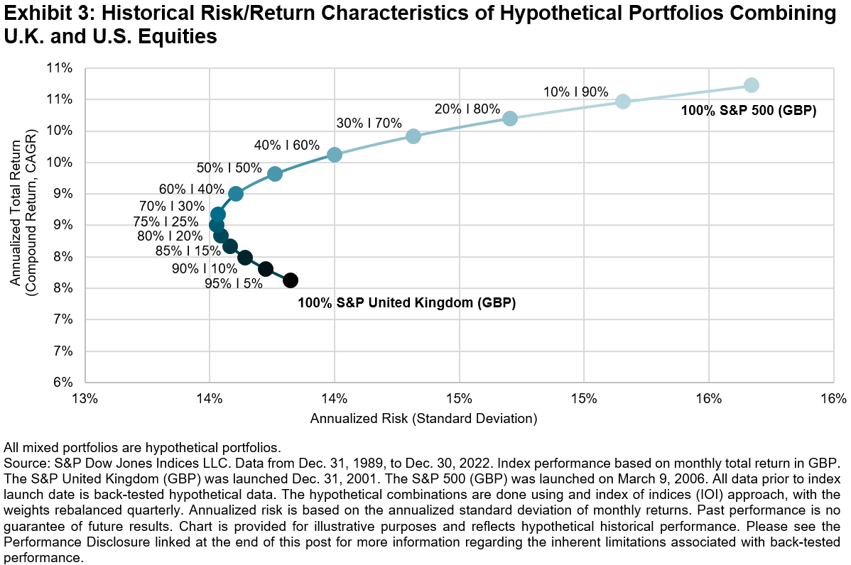 From a performance perspective, U.S. large caps have outperformed their U.K. counterparts most of the time and by a larger magnitude when they do. Over the past 33 calendar years, the S&P 500 has outperformed the S&P United Kingdom two-thirds of the time, as shown in Exhibit 2. In the years when the S&P 500 outperformed it did so by a higher margin on average, at 9.9%, compared to the U.K.’s 8%. This has meant combining the S&P 500 and the S&P United Kingdom (as shown in Exhibit 3) has historically improved the risk/return profile and provided a higher return per unit of risk than a U.K. investment in isolation.