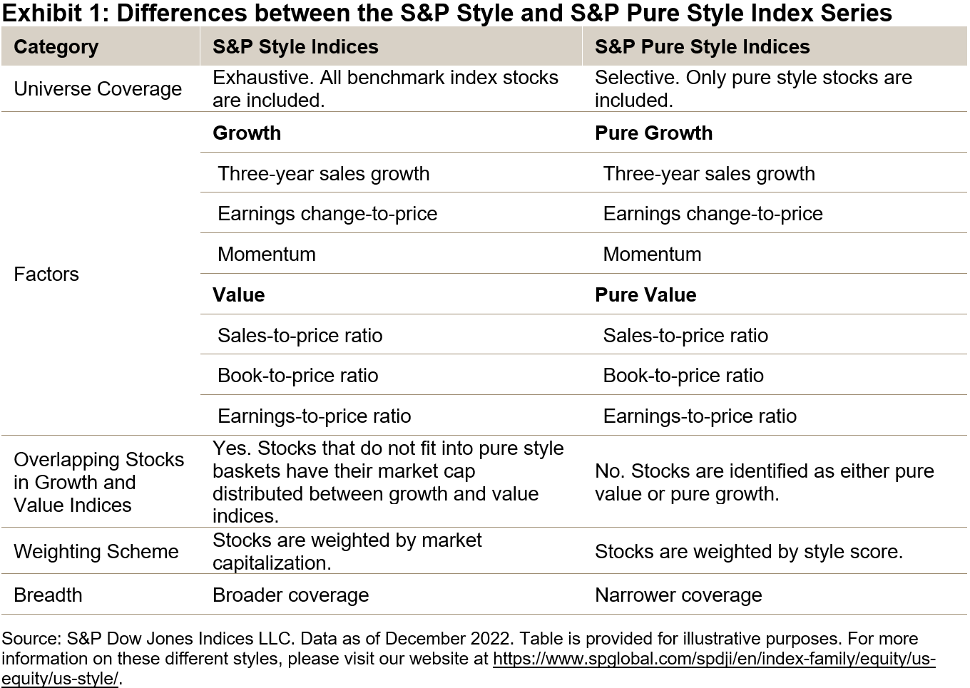 Exhibit 1 summarizes the index construction of the two series. S&P Style Indices provide broad style exposure, covering all stocks in the benchmark universe and dividing the benchmark weight into roughly equal portions at each annual reconstitution. S&P Pure Style Indices have a more selective focus and weight companies by their style scores, rather than in proportion to their float market capitalization. Both series use the same six factors to define growth and value.