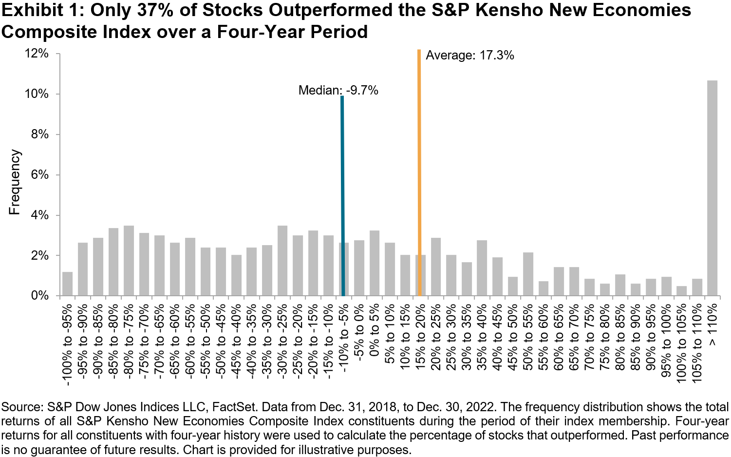 In the case of broad equity markets, one important cause of the difficulty in outperforming through the selection of single stock “picks” is that in most markets, the distribution of single stock returns is positively skewed, with the result that only a minority of constituent stocks outperform the index, particularly as the time horizon extends. The universe of stocks defined by the S&P Kensho New Economies Composite Index proves to be no exception. Exhibit 1 plots the distribution of cumulative returns of the index constituents over the past four years: the median return of -9.7% is far less than the average of 17.3% and, during the period, only 37% of stocks outperformed the index.