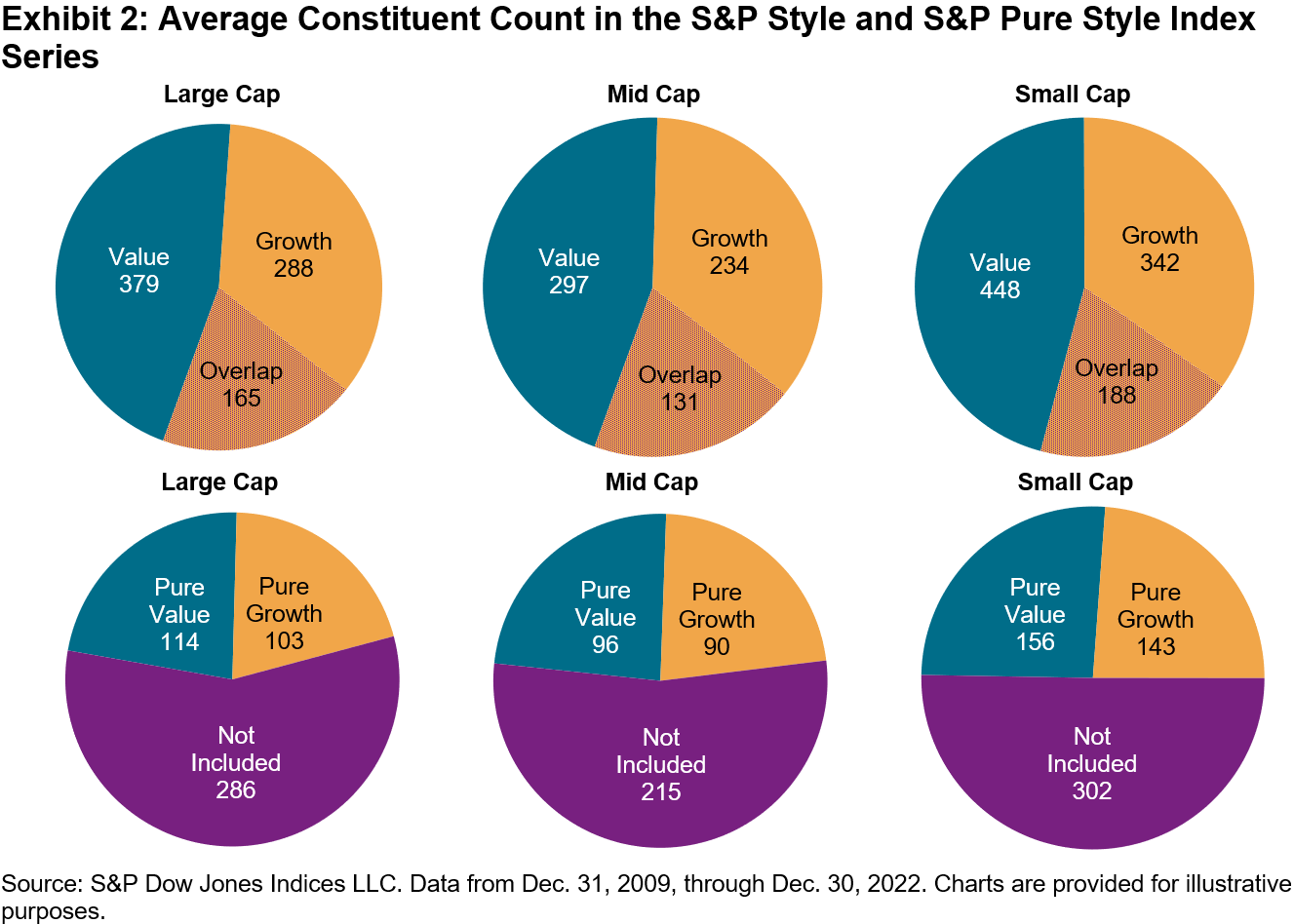 Differences in index construction help to explain the different constituent counts in the two types of indices. For example, Exhibit 2 shows that companies can be found in both growth and value indices, whereas there is no overlap between the pure growth and pure value indices. The pure style baskets also contain fewer constituents than their style counterparts, reflecting a more selective approach to style exposures.