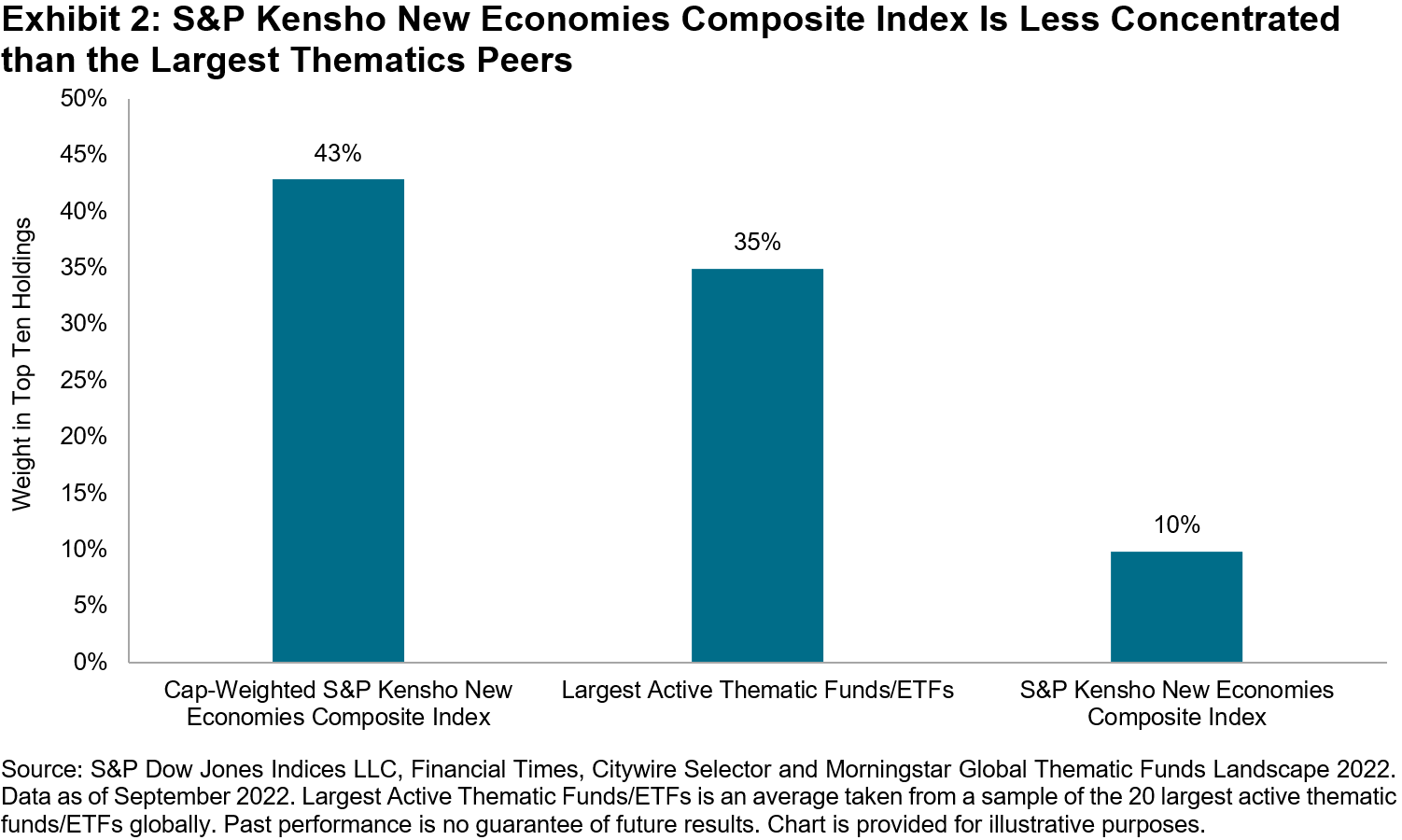 This highlights the difficulty for thematic active managers seeking to outperform with concentrated portfolios, because when faced with a distribution of returns that is positively skewed (like in Exhibit 1), holding more stocks increases the likelihood of outperformance. The problem is of particular concern in the thematics space because, given the inherently granular nature of certain themes, the challenge of avoiding undue concentration is especially germane. For example, there are only 31 constituents within the S&P Kensho Robotics Index, one of the 25 subsectors that make up the 559 constituents within the S&P Kensho New Economies Composite Index (as of Dec. 30, 2022). In addition to being diversified across themes, the composite index’s concentration is further mitigated by a modified equal-weight approach applied in the construction of each subsector. The result of all of which is an index that is less concentrated than would be the case if a simple market-cap weighting scheme were followed.