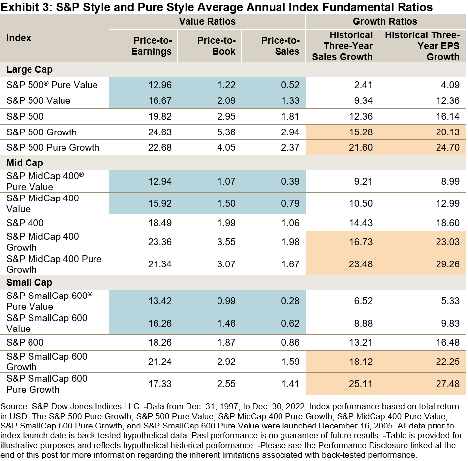 The selective focus of pure style indices means that S&P Pure Value and Pure Growth Indices reflect stronger value and growth characteristics than their style counterparts. Exhibit 3 shows this by comparing the average annual fundamental ratios of various indices: pure value indices typically had lower price-to-earnings, price-to-book and price-to-sales ratios, while pure growth indices had higher three-year sales growth and three-year EPS growth rates.