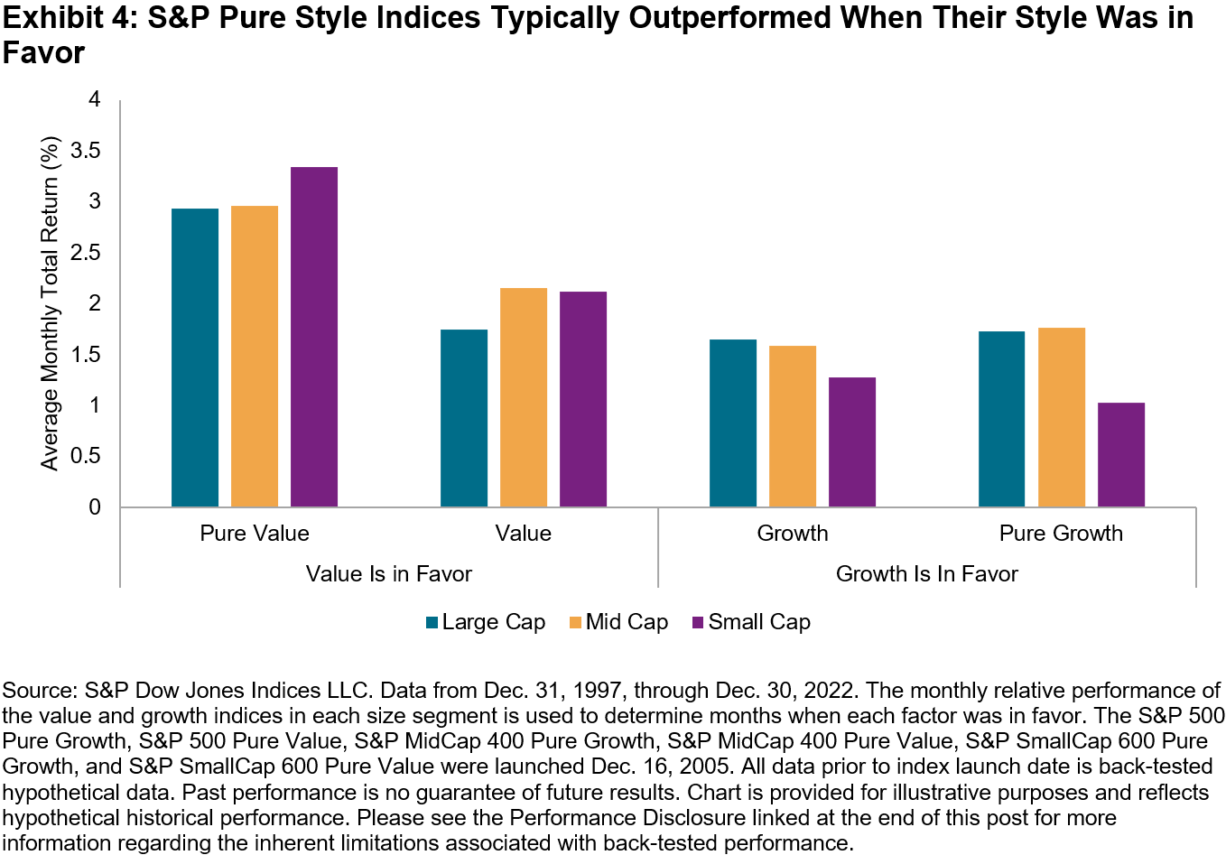 Unsurprisingly, perhaps, Exhibit 4 shows that S&P Pure Style Indices typically outperformed their S&P Style Index counterparts in months when their style was in favor. Based on data since 1997, Exhibit 4 shows that S&P Pure Style Indices posted higher average monthly total returns than S&P Style Indices when their style outperformed.