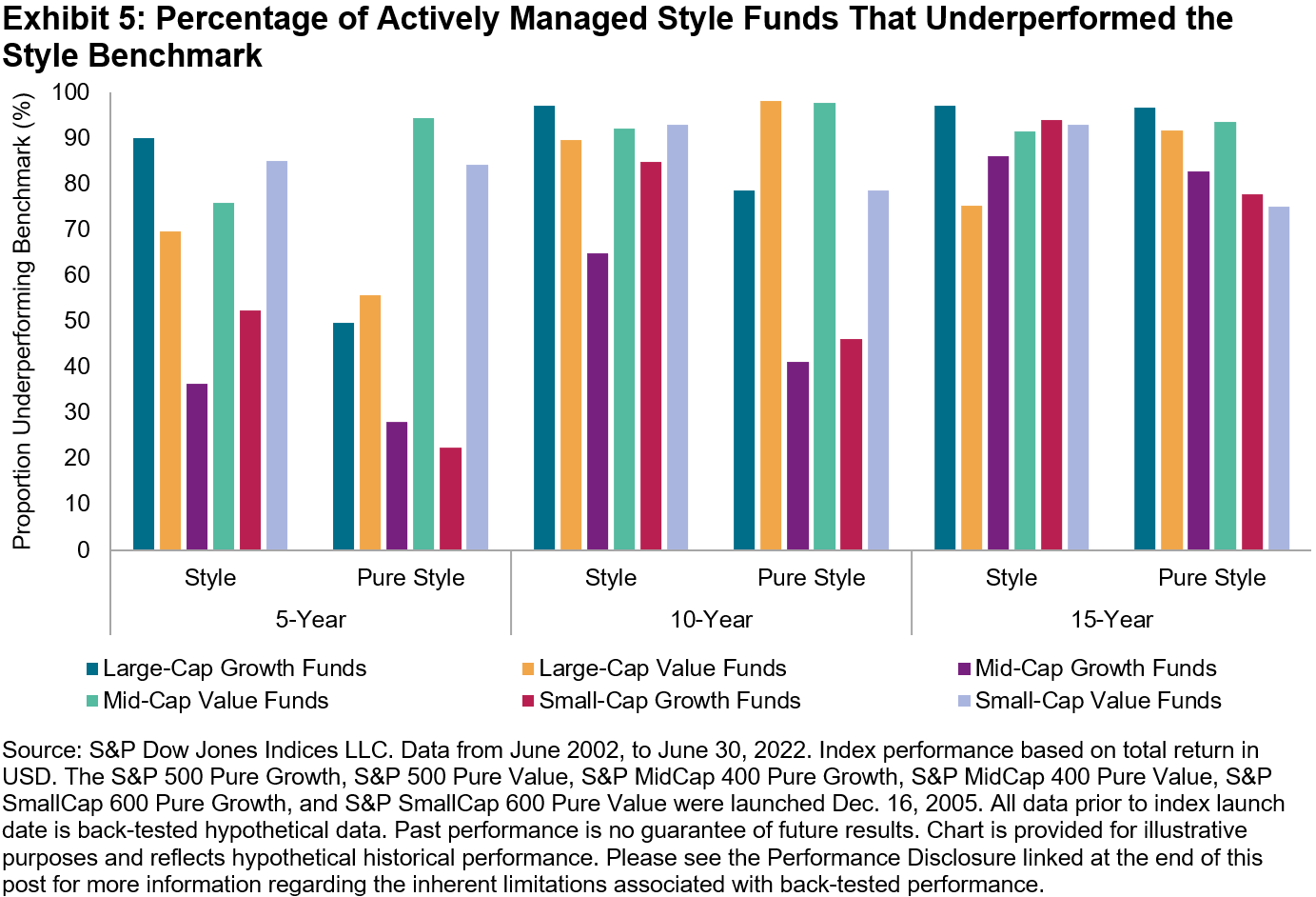 Lastly, we compare how actively managed funds have fared against the S&P Style and Pure Style Indices. Exhibit 5 compiles historical data of the percentage of actively managed style funds that underperformed both index series. Even though some active managers had success in shorter time periods, the S&P Style and S&P Pure Style Indices were difficult to beat over long-term horizons.
