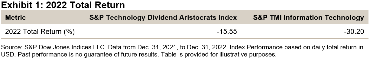 As high inflation, rising interest rates and geopolitical risks dominated the headlines in 2022, technology stocks had a particularly difficult year. Given the many headwinds facing the sector, the S&P Total Market Index (TMI) Information Technology returned -30.20% in 2022. In spite of the challenging market environment, the S&P Technology Dividend Aristocrats® Index fared relatively well, dropping about one-half the amount of the S&P TMI Information Technology, representing an outperformance of 14.66%. In this blog, we will analyze the S&P Technology Dividend Aristocrats index methodology as well as examine its dividend emphasis and style tilts.