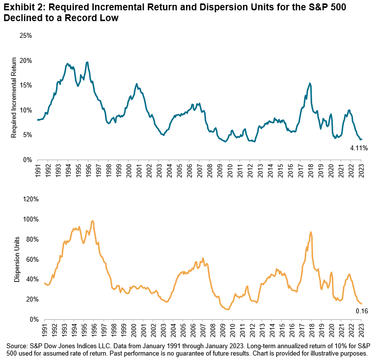 In Exhibit 4, the S&P Technology Dividend Aristocrats Index demonstrated a value and dividend yield tilt versus the S&P TMI Information Technology. Specifically, the S&P Technology Dividend Aristocrats Index had higher Axioma Risk Factor Z-scores for the book-to-price and dividend yield factors, similar exposure to earnings yield and lower exposure to growth factors. The value and dividend tilt proved beneficial in the rising interest rate environment in 2022. Holding all else equal, value and dividend stocks offered relatively more protection in a rising interest rate environment compared with growth stocks, due to their lower durations.