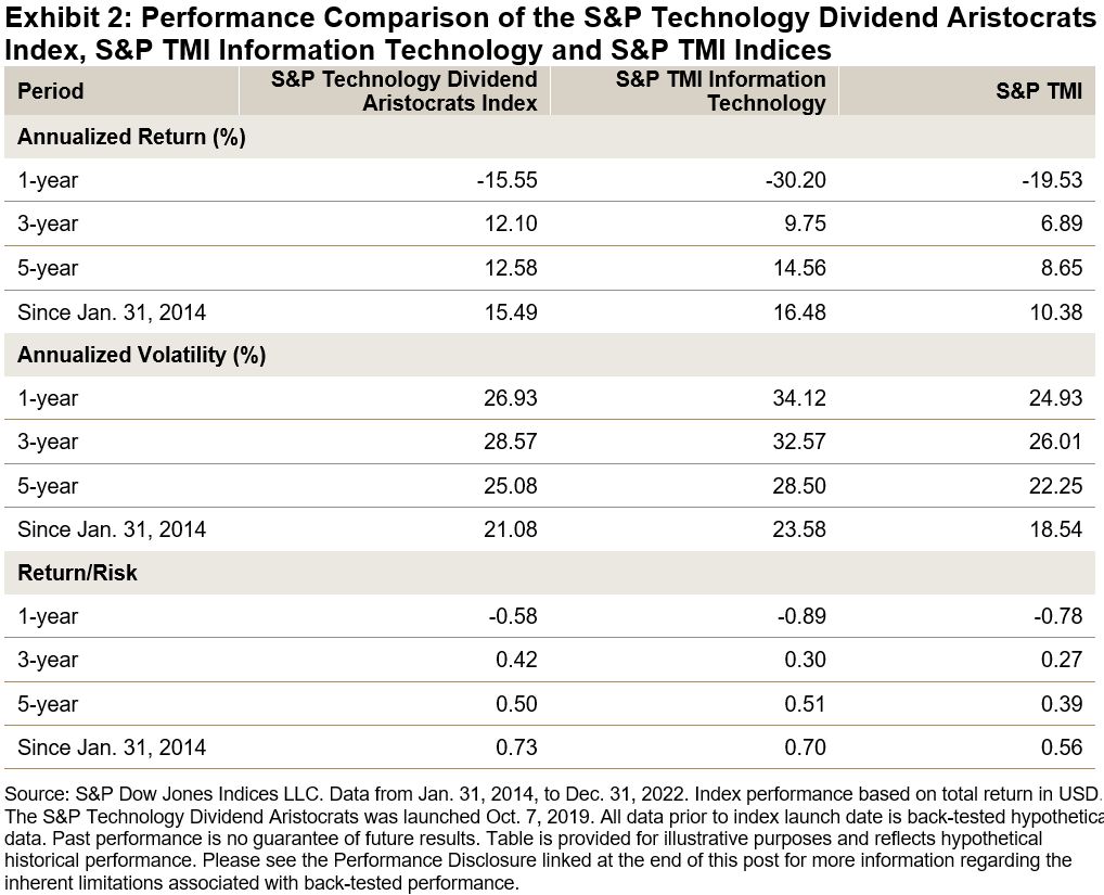 The S&P Technology Dividend Aristocrats Index outperformed both the S&P TMI Information Technology and the S&P TMI over the one- and three-year periods. Furthermore, on a risk-adjusted basis, the S&P Technology Dividend Aristocrats Index outperformed both benchmarks over all periods shown, except for the five-year period versus the S&P TMI Information Technology (0.50 versus 0.51). Importantly, the S&P Technology Dividend Aristocrats Index had lower volatility than the S&P TMI Information Technology for all periods.