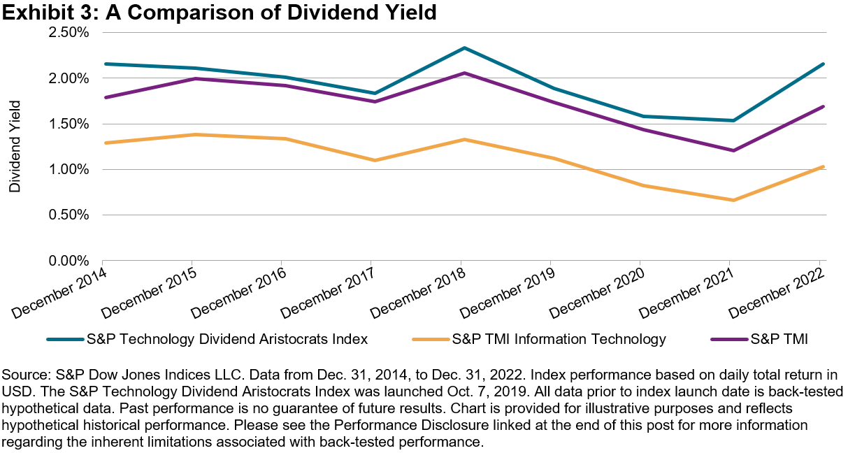 Exhibit 3 shows the annual trailing one-year dividend yield from Dec. 31, 2014, to Dec. 31, 2022. In every year over this period, the S&P Technology Dividend Aristocrats Index had a higher dividend yield than both the S&P TMI Information Technology and S&P TMI. On average, the S&P Technology Dividend Aristocrats Index had a dividend yield of 1.96%, while the S&P TMI Information Technology and S&P TMI had dividend yields of 1.12% and 1.73%, respectively.