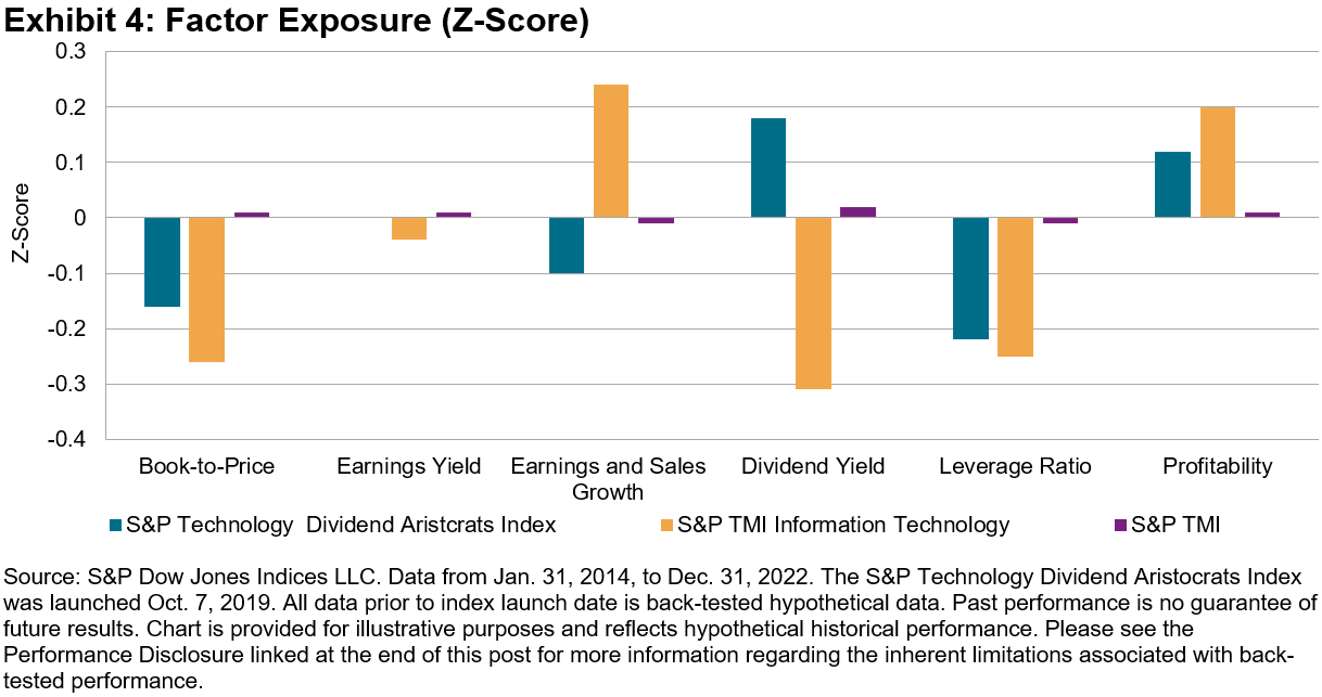 Furthermore, both the S&P Technology Dividend Aristocrats Index and S&P TMI Information Technology showed higher quality characteristics (lower leverage and higher profitability) than the S&P TMI.