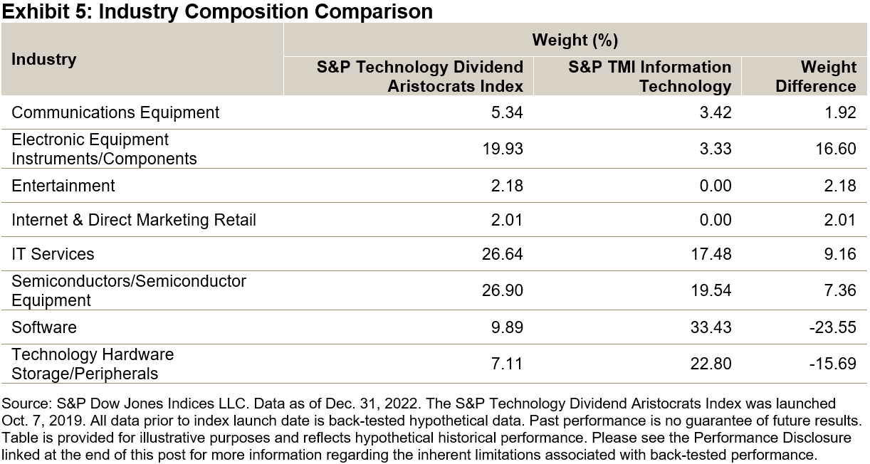 Exhibit 5 shows the industry composition of the indices as of Dec. 31, 2022. The S&P Technology Dividend Aristocrats Index underweighted Software (driven by an underweight in Microsoft) and Technology Hardware Storage/Peripherals (driven by an underweight in Apple), and had a material overweight to the Electronic Equipment Instruments/Components industry.
