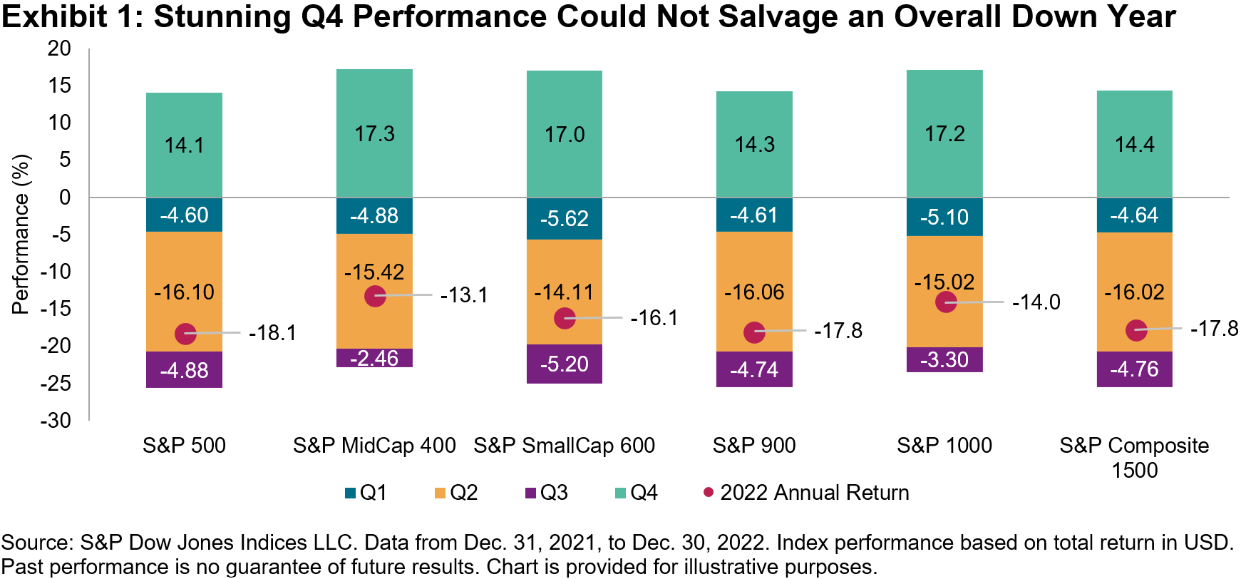 2022 was a challenging year across asset classes, including equities. Exhibit 1 shows that there were declines across the U.S. equities market cap spectrum. For example, the S&P 500® fell 18% for the whole year; the gains in the fourth quarter were not sufficient to overcome the declines during the first three quarters.