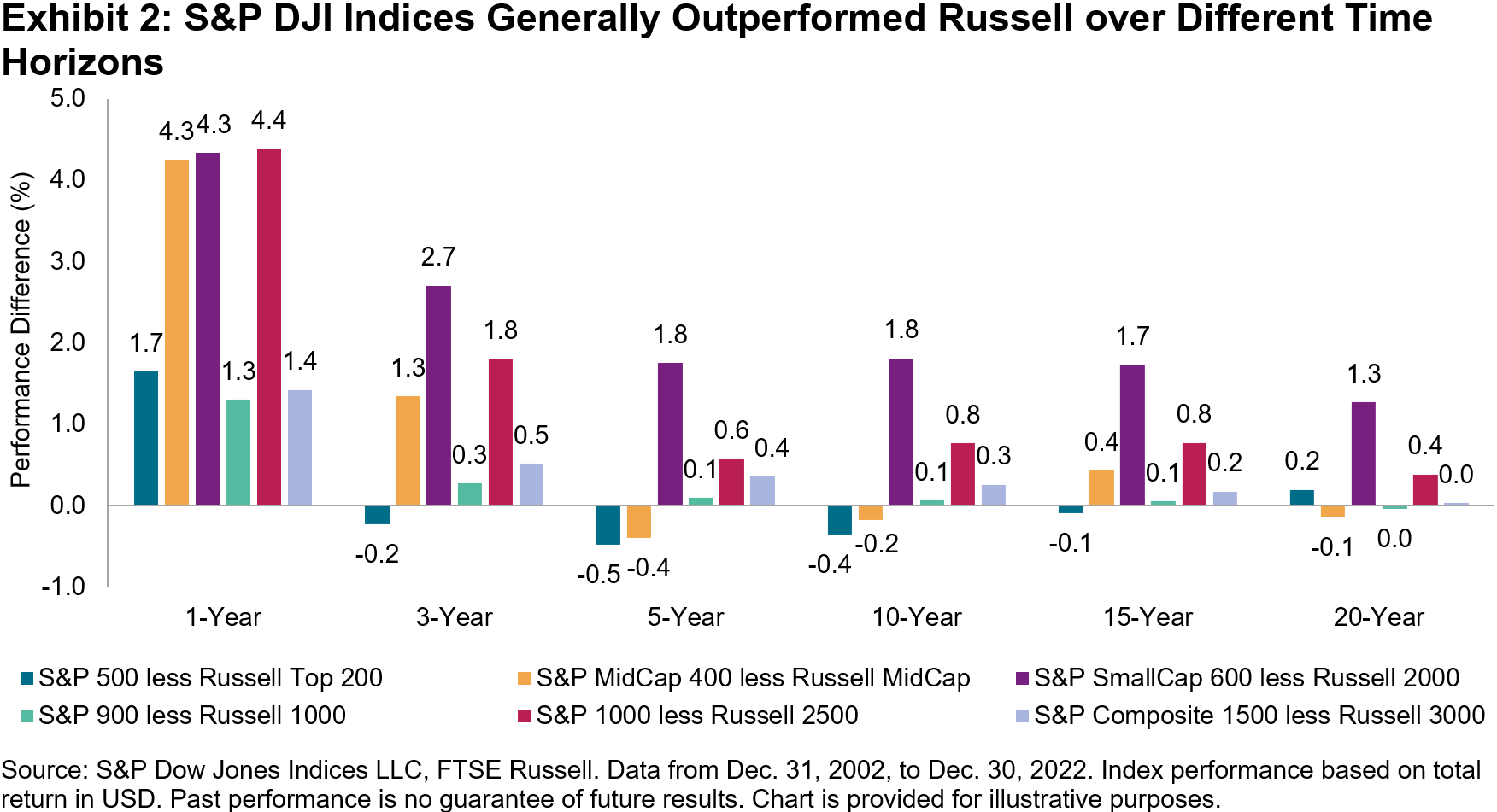 Amid the turbulent environment, S&P DJI’s U.S. equity indices fared well relative to their Russell counterparts, generally outperforming in most months over the past year. For instance, the S&P 500 outperformed the Russell Top 200 by 1.7% in 2022, its largest margin since 2011. The S&P SmallCap 600® outperformed the Russell 2000 by 4.3%, far above its average annual outperformance since 1995 (1.7%), and the S&P 900 and S&P Composite 1500® outperformed their Russell counterparts by 1.3% and 1.4%, respectively, both the third-highest margins since 1996.