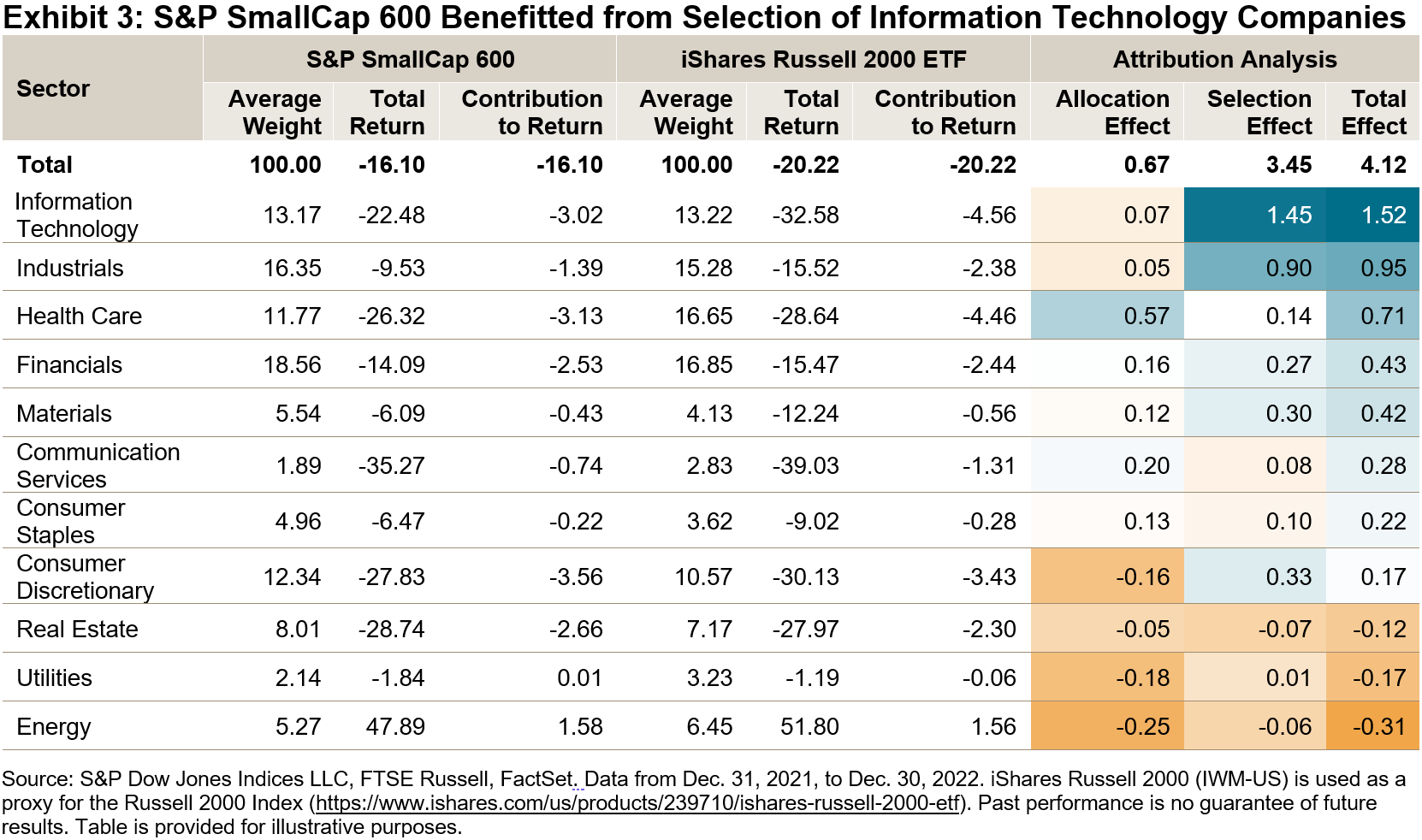 Information Technology exposure was a key reason for the outperformance of S&P DJI’s indices last year. Exhibit 3 shows that the choice of Information Technology companies (selection effect) accounted for over 80% of the overall S&P SmallCap 600 outperformance against the Russell 2000. Other major S&P DJI’s indices tell a similar story: S&P DJI’s U.S. equity indices benefited from less exposure to, and better selection in, the Information Technology sector in 2022.