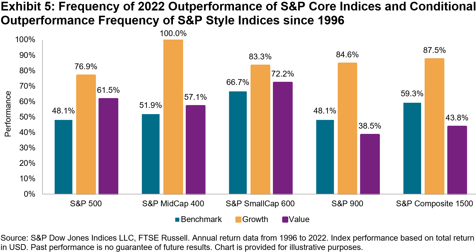 More broadly, Exhibit 5 shows how the frequency of outperformance by the S&P Style Indices generally increased with the frequency of outperformance by the S&P Core Indices. The frequency of outperformance is based on annual total returns of the S&P DJI indices and their Russell counterparts since 1996. The blue bars represent benchmark indices, while the other two colors represent S&P DJI’s outperformance conditional on the benchmark outperformance of respective style indices. For example, the S&P MidCap 400 outperformed the Russell MidCap index in 51.9% of years between 1996 and 2022. And in years when the S&P MidCap 400 outperformed, the S&P MidCap 400 Growth always outperformed the Russell MidCap Growth.