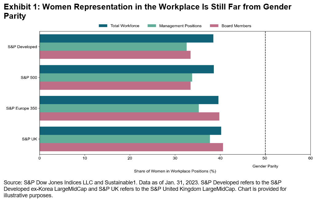 Going beyond equal opportunities and creating equal outcomes requires recognizing heterogeneity of women’s characteristics and circumstances, in order to remove systemic barriers that hinder long-term success. Data from the S&P Global Corporate Sustainability Assessment (CSA)7 suggests that workplace gender gaps persist across regions, sectors and managerial positions. There is more to do to bring and retain women in the workplace and empower them to attain their full potential. The benefits of doing so are vast and contribute to the UN’s Sustainable Development Goals’ agenda on Gender Equality.