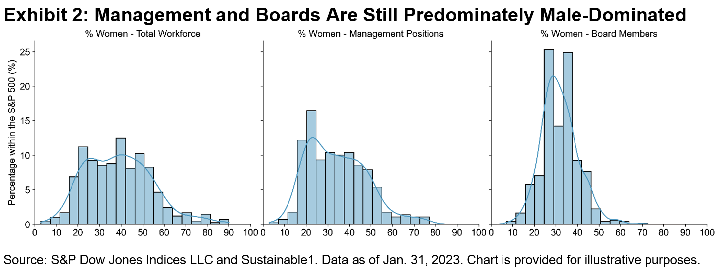 While weighted averages are helpful, they might not paint the full picture. We examine the distribution of female representation across three functions within the S&P 500. Management and board positions’ frequency distribution tends to be centered around lower percentages of women appointments (see Exhibit 2).