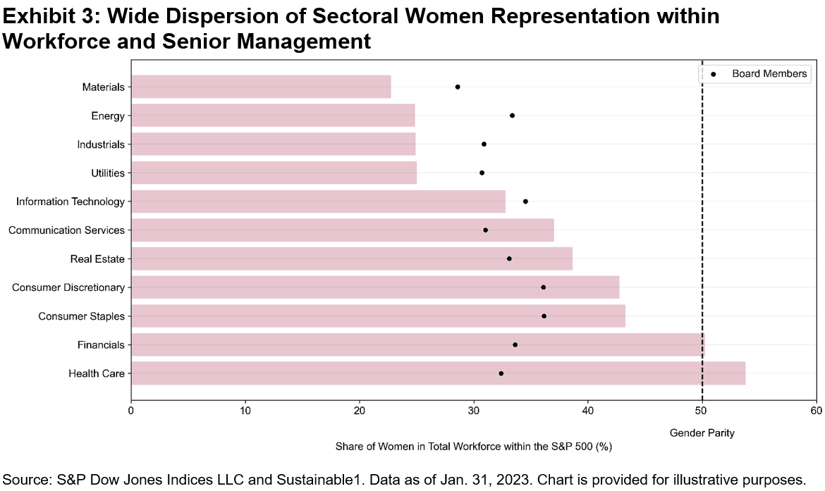 Looking at the S&P 500 from a sectoral perspective, Health Care and Financials lead the charts, with women representing at least 50% of total workforce, having reached gender parity (see Exhibit 3). Conversely, Materials and Energy are the least gender-diverse sectors. It is worth noting the sectoral dispersion between total workforce and boards’ women composition. The difference between most and least diverse sectors for board membership is 7.6%, while for total workforce is 31%.
