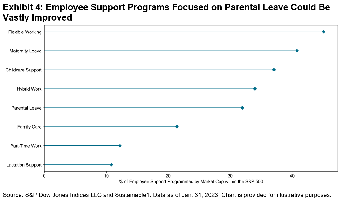 Not only are women still underrepresented across most corporate ladder levels, they are also leaving companies at an alarming rate relative to their male counterparts.6 Talent retention is increasingly important for women’s career advancement. Employee support programs, such as paid parental leave, flexible working and hybrid arrangements, can be highly beneficial. More than 45% of companies within the S&P 500 adopt flexible working and 40% have paid maternity leave (more than legally required), but only 32% offer paid non-primary parental leave (see Exhibit 4).