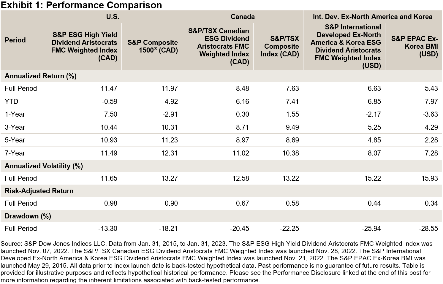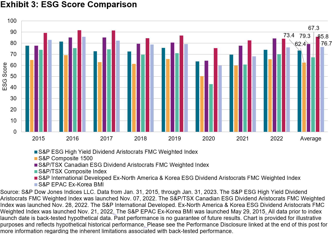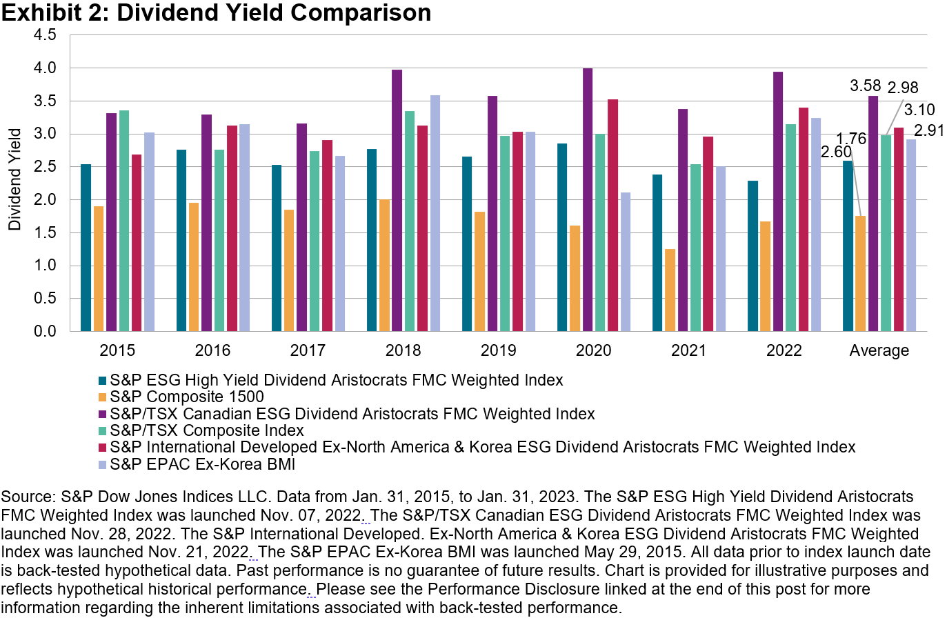 Amid rising interest rates and the uncertain macroeconomic environment last year, dividend-focused strategies received substantial inflows throughout 2022.  On top of these recent macroeconomic trends is also the longer-term, structural development of increasing investor demand for investments that align with their personal and societal values. Against this backdrop, S&P Dow Jones Indices (S&P DJI) recently launched the S&P ESG High Yield Dividend Aristocrats® FMC Weighted Index, S&P/TSX Canadian ESG Dividend Aristocrats FMC Weighted Index and S&P International Developed Ex-North America & Korea ESG Dividend Aristocrats FMC Weighted Index.