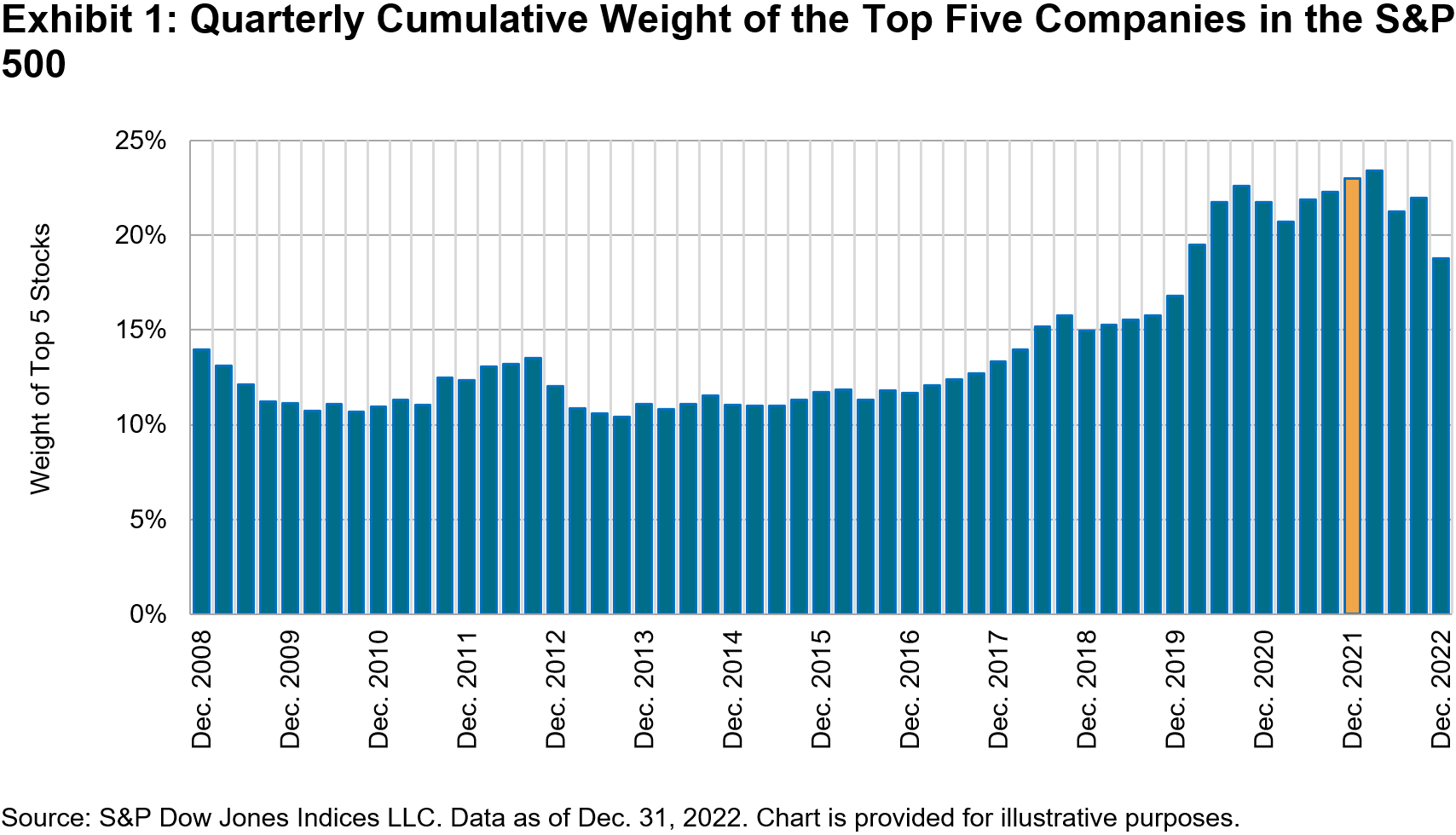 This is exactly what seems to have happened between 2013 and 2021. In the summer of 2013, the largest five companies in the S&P 500 accounted for roughly 11% of the index’s weight. As Exhibit 1 shows, this concentration more than doubled to over 23% by December 2021; not coincidentally, our SPIVA U.S. Year-End 2021 Scorecard reported a one-year underperformance rate of 85% for actively managed large-cap U.S. equity funds—close to a record high for any year of the scorecard’s 20-year history.