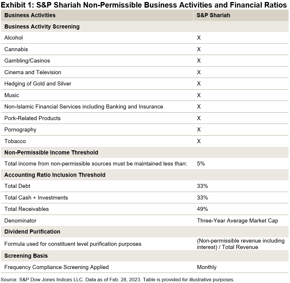Compliant indices cater to the Islamic market by limiting inclusion to companies that pass rules-based Shariah screening. The criteria are defined by a board of Islamic scholars and consist of two main components: business activities and financial ratios (see Exhibit 1).4