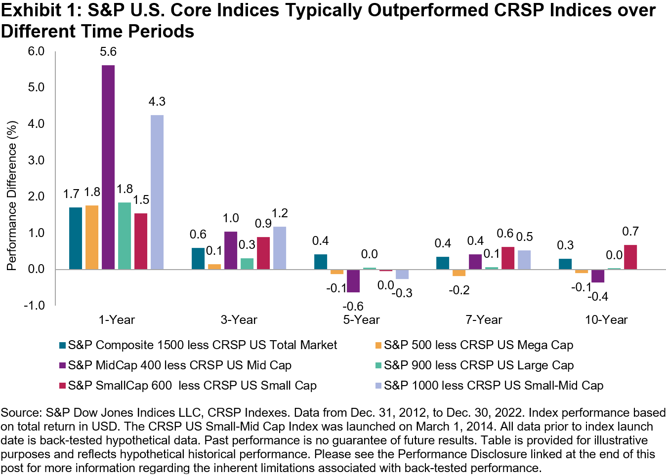 Exhibit 1 shows the performance of these indices against their CRSP counterparts. S&P U.S. Equity Indices typically outperformed over distinct time horizons, and they outperformed across the cap spectrum in 2022, continuing the positive mid-year trend.