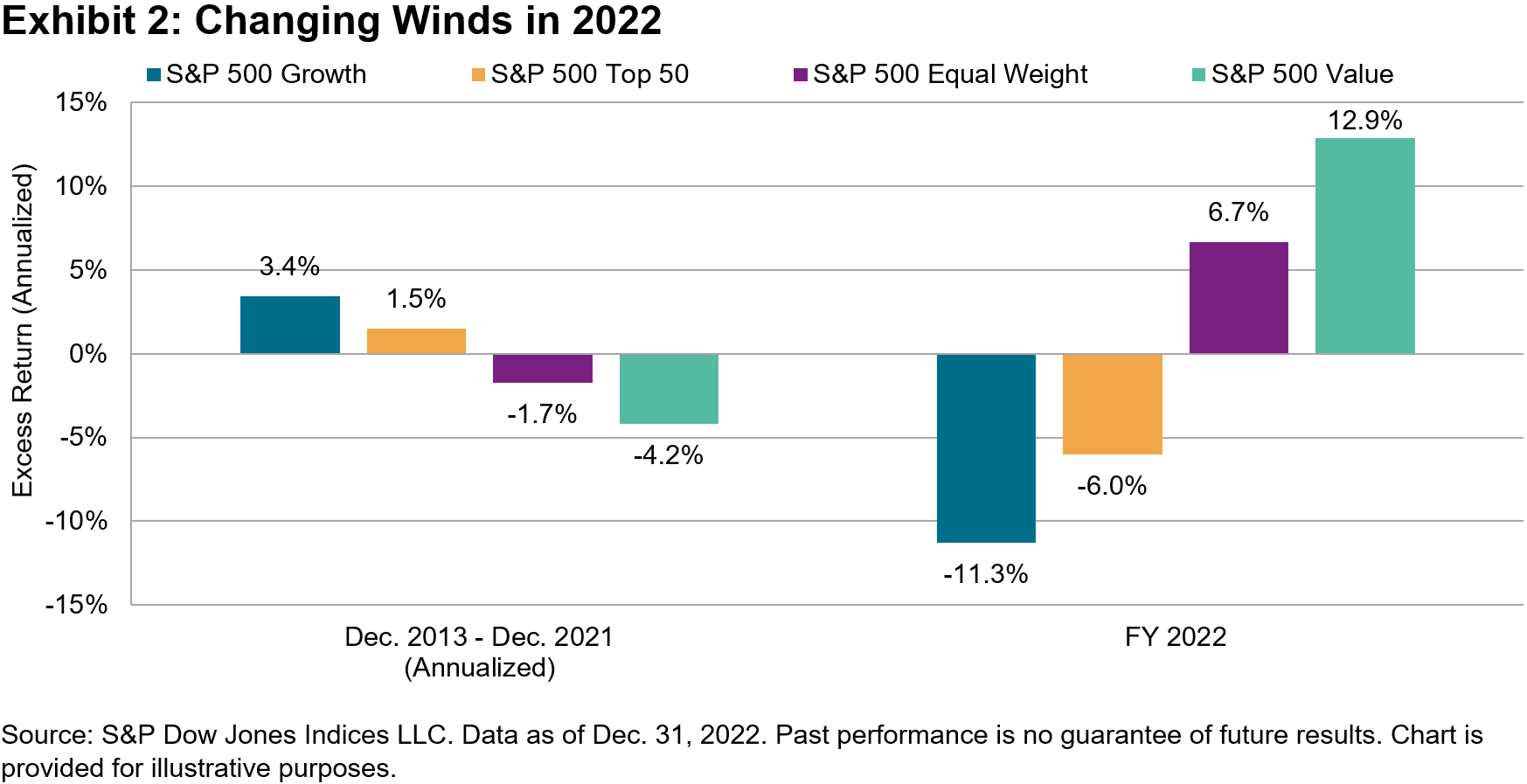 However, as can also be seen in Exhibit 1, concentration began to diminish in 2022. Previous market darlings, including Facebook, Amazon, Alphabet, Microsoft, Tesla and Apple, to name a few, underperformed materially. Meanwhile, as the U.S. dollar strengthened, smaller and more domestically oriented names were judged to have better prospects, while previously unfancied companies in the Materials and Energy sectors benefited from a steep rise in commodity prices. Exhibit 2 summarizes the changes in fortune that swept through markets last year, comparing the annualized excess returns (versus the S&P 500) for a range of large-cap indices in two periods: December 2013 to December 2021, and over the full-year 2022.