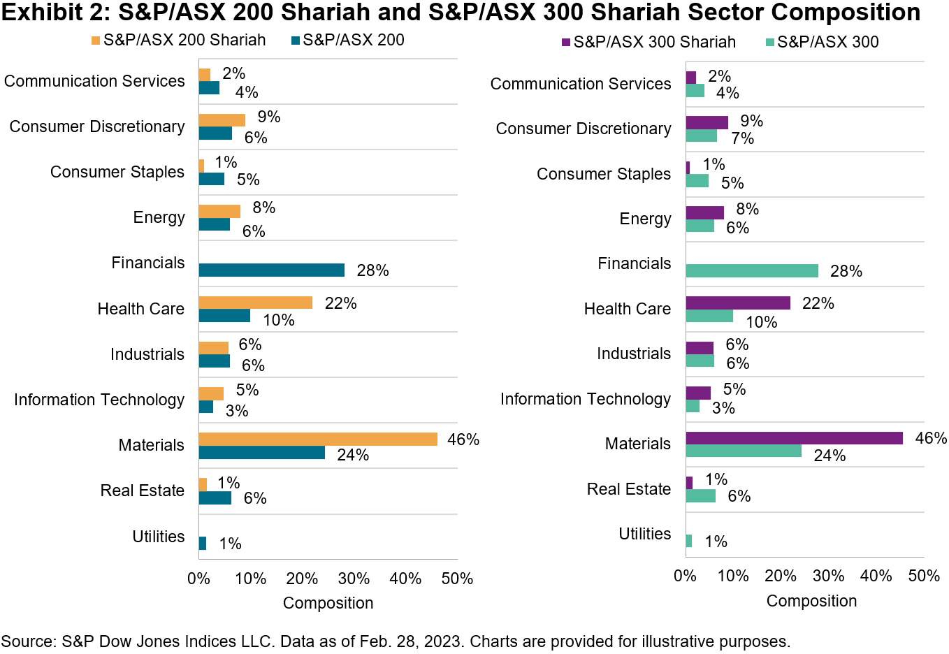 The absence of the Financials sector due to the business activity screen is the most notable difference between the benchmark index and its Shariah-compliant version. This results in a substantial increase in Materials and Health Care weight in the Shariah indices.