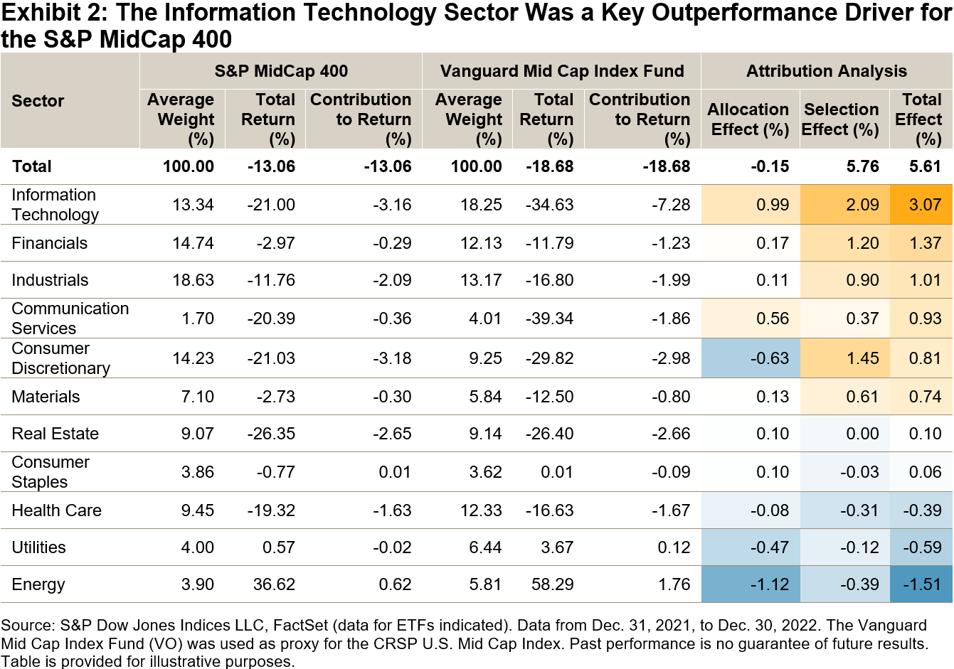 For example, Exhibit 2 shows the attribution analysis of the S&P MidCap 400 against the CRSP U.S. Mid Cap Index. The analysis assesses the portion of S&P 400® relative returns in 2022 that came from differences in GICS® sector exposures (allocation effect) versus the choice of companies in each sector (selection effect). A key takeaway from Exhibit 2 is that while the S&P 400 benefited from having less exposure to IT, which underperformed, the choice of companies in the sector (selection effect) had an even greater impact. Similar results were observed across the cap spectrum in 2022.
