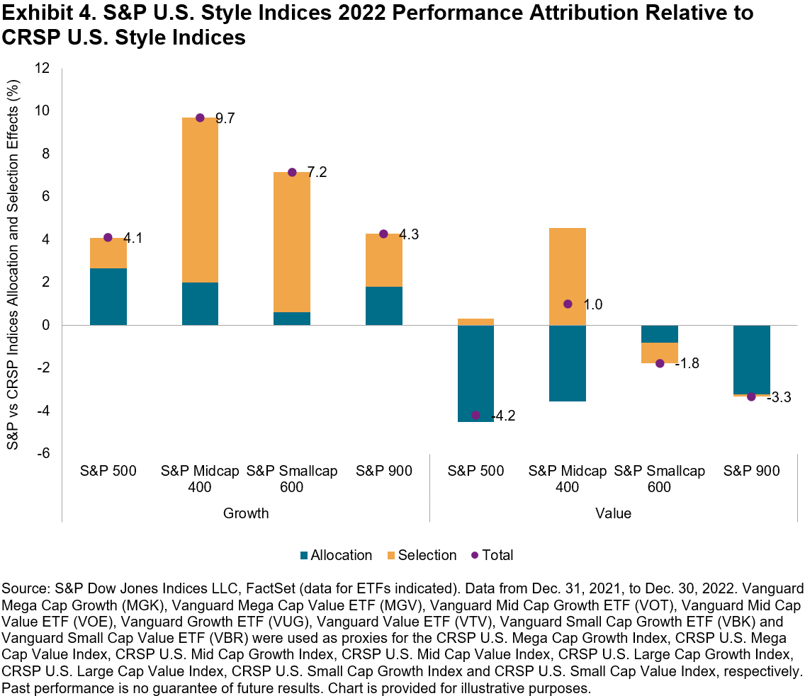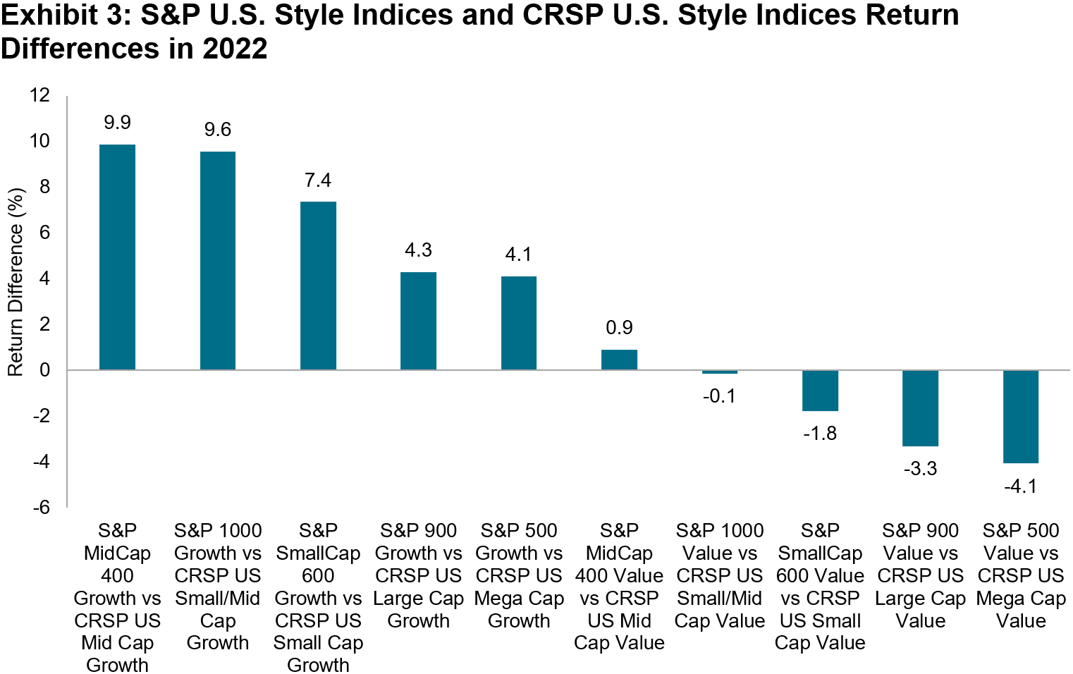 The S&P U.S. Core Indices’ 2022 outperformance drove the S&P U.S. Growth Indices’ relative returns versus CRSP growth indices. Exhibit 3 shows that the S&P U.S. Growth Indices outperformed their CRSP growth counterparts across the market cap spectrum, with the S&P MidCap 400 Growth (9.9%) and S&P 1000 Growth (9.6%) indices recording their second-largest outperformance rates since 2016. S&P U.S. Value Indices generally underperformed, although the S&P MidCap 400 Value slightly outperformed the CRSP U.S. Mid Cap Value Index, by 0.9%.