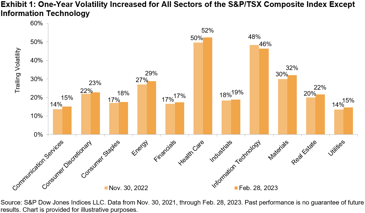 Volatility rose for every sector of the S&P/TSX Composite Index except for Information Technology, which, nonetheless, remains the second most volatile sector, preceded only by Health Care.