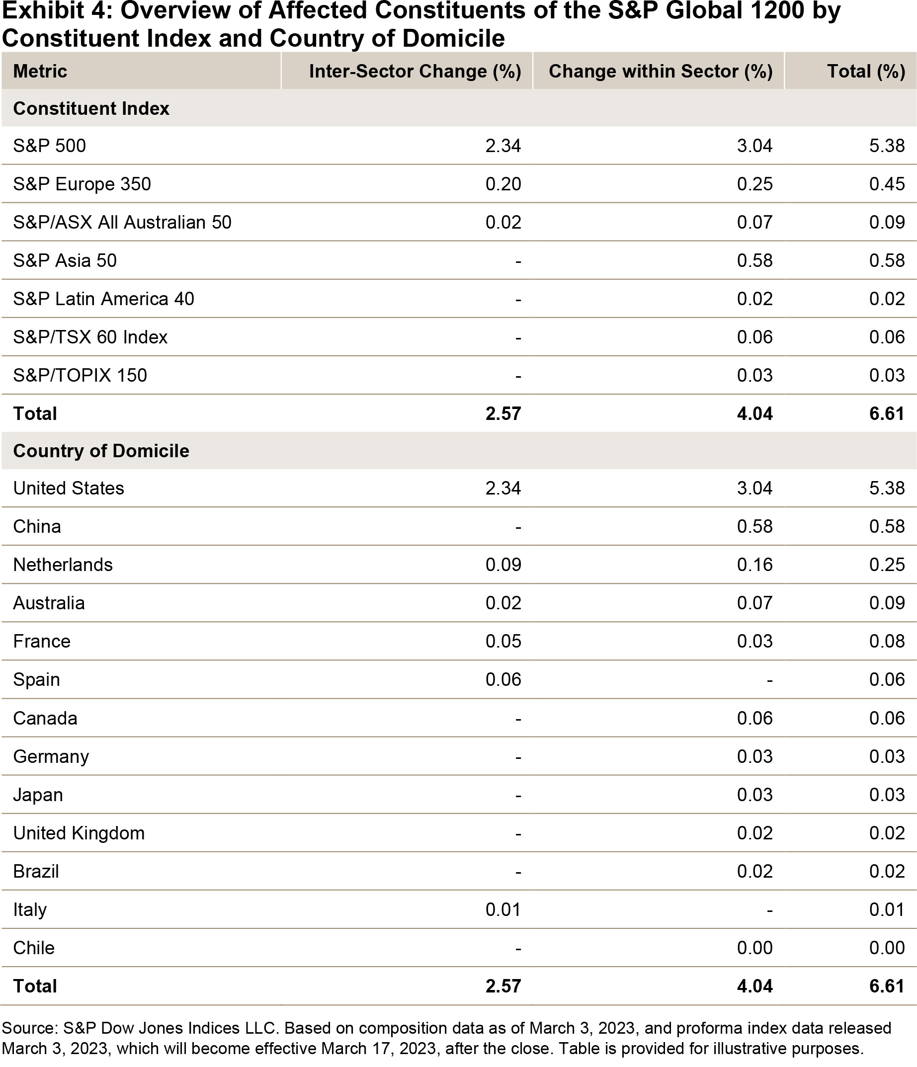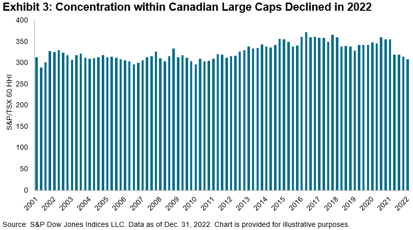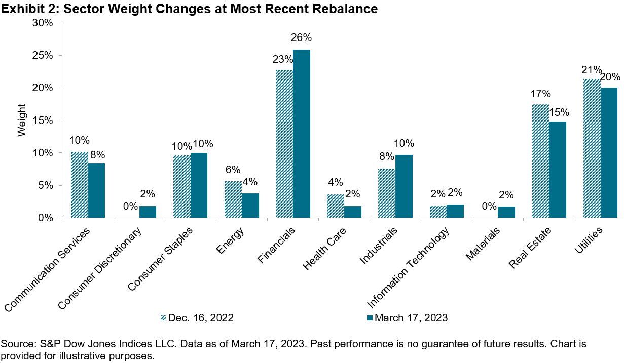 The latest rebalance for the S&P/TSX Composite Low Volatility Index, effective after market close on March 17, 2023, wrought minor shifts. Notably, the Materials sector made a reappearance after more than a year’s absence, holding 2% of the low volatility index. Financials added to its already dominant position (up 3%), which came mostly from Real Estate. The remaining sectors all experienced minor shuffles.