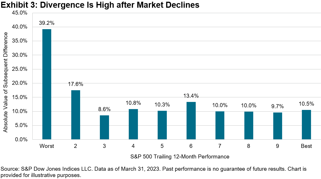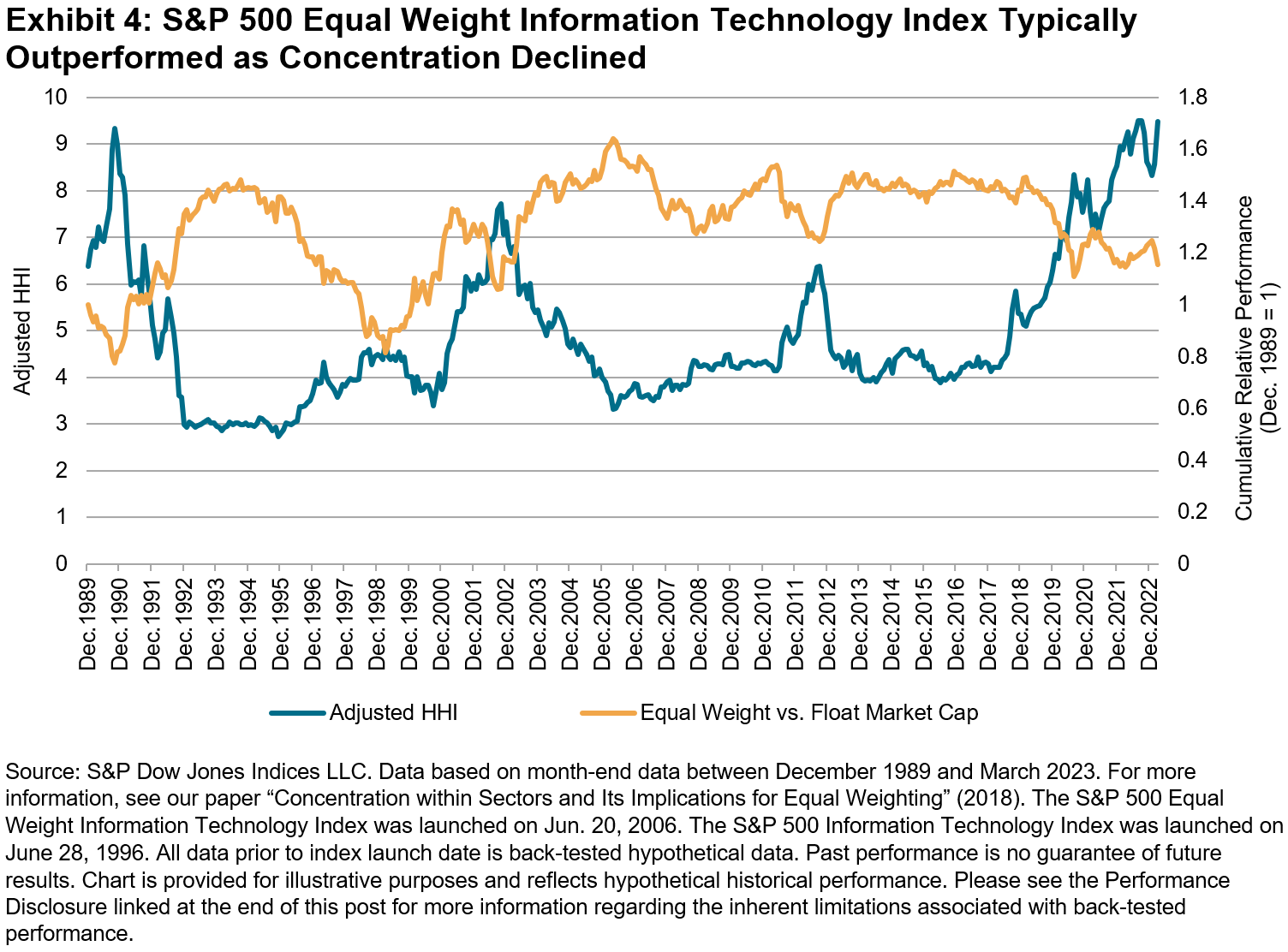 Exhibit 4 confirms this expectation: the S&P 500 Equal Weight Information Technology Index typically outperformed its float market-cap counterpart when the sector’s adjusted HHI declined. Hence, to the extent that current concentration levels decline, market participants may wish to consider the potential applications of an equally weighted sector strategy.