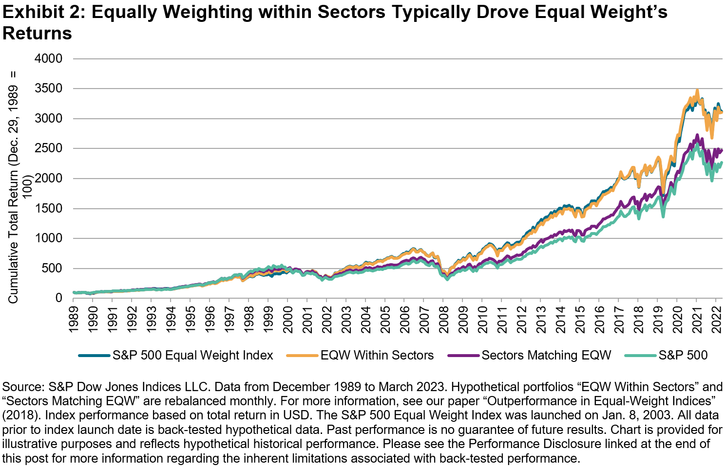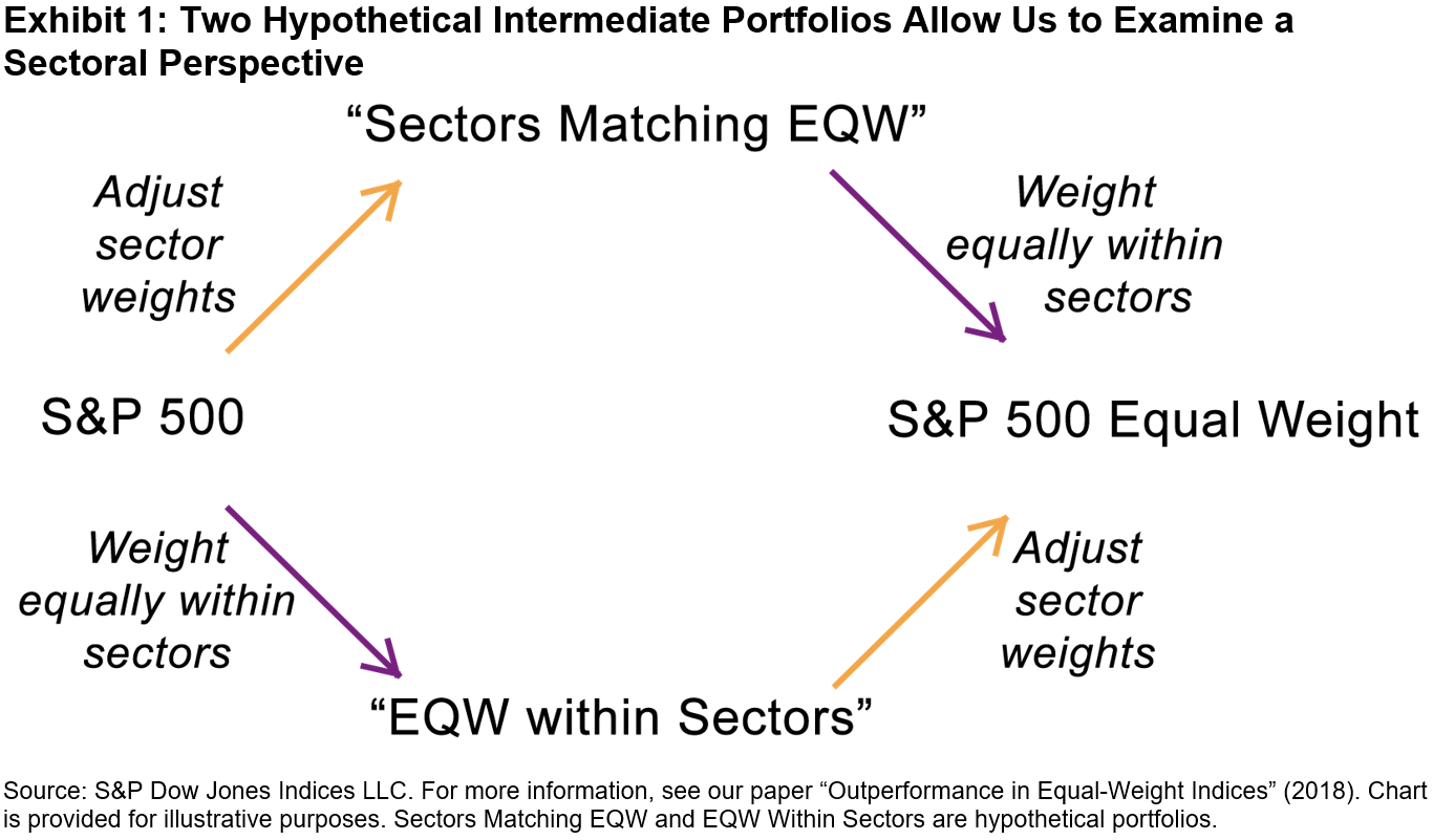 The hypothetical “Sectors Matching EQW” portfolio adjusts S&P 500 sector weights so that they match those of the Equal Weight Index while ensuring that companies within the same sector remain float market-cap weighted. Alternatively, the hypothetical “EQW Within Sectors” portfolio retains the S&P 500’s sector allocations but weights every name equally within each sector.