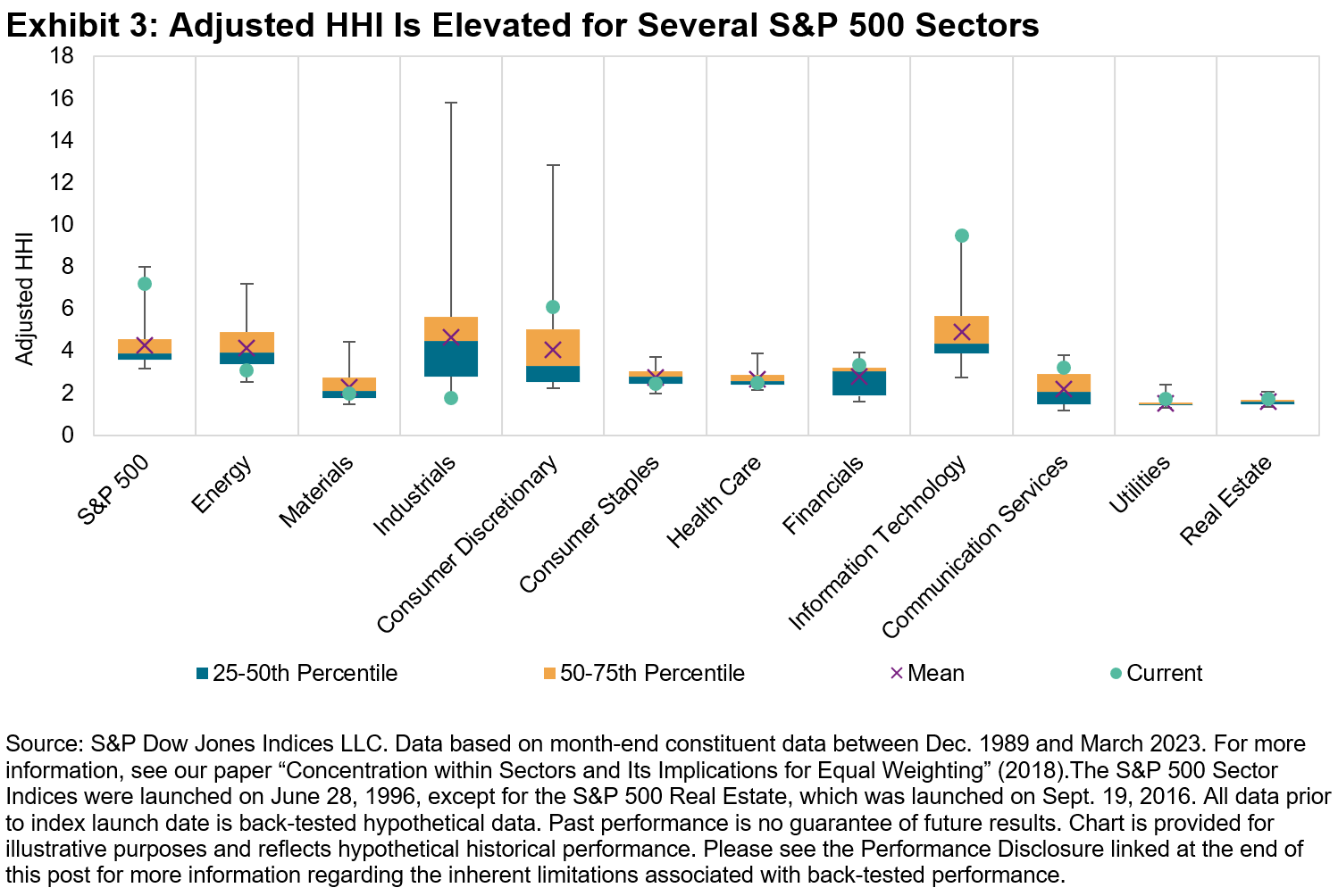 The relative degree of concentration within sectors suggests a potential tactical application. Exhibit 3 shows the distribution of adjusted Herfindahl-Hirschman Index (HHI) figures for the S&P 500 and its 11 GICS sectors; a higher adjusted HHI figure means that concentration is higher, independent of the number of stocks in each index. The current concentration is elevated in several sectors, particularly in Information Technology.