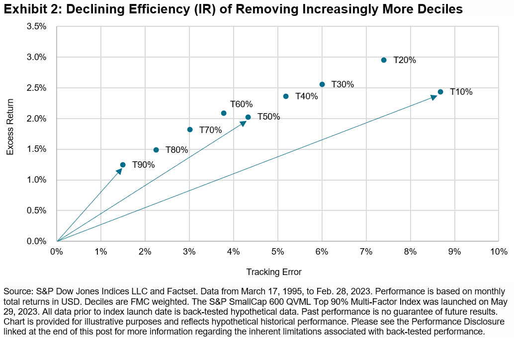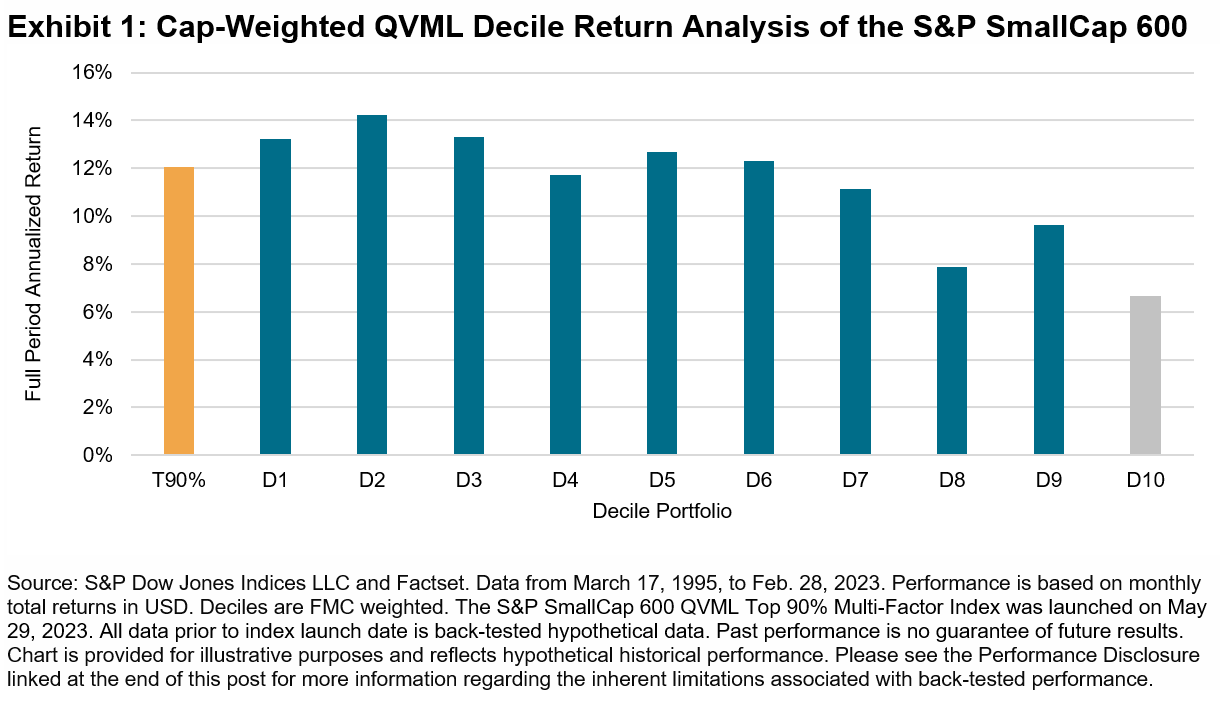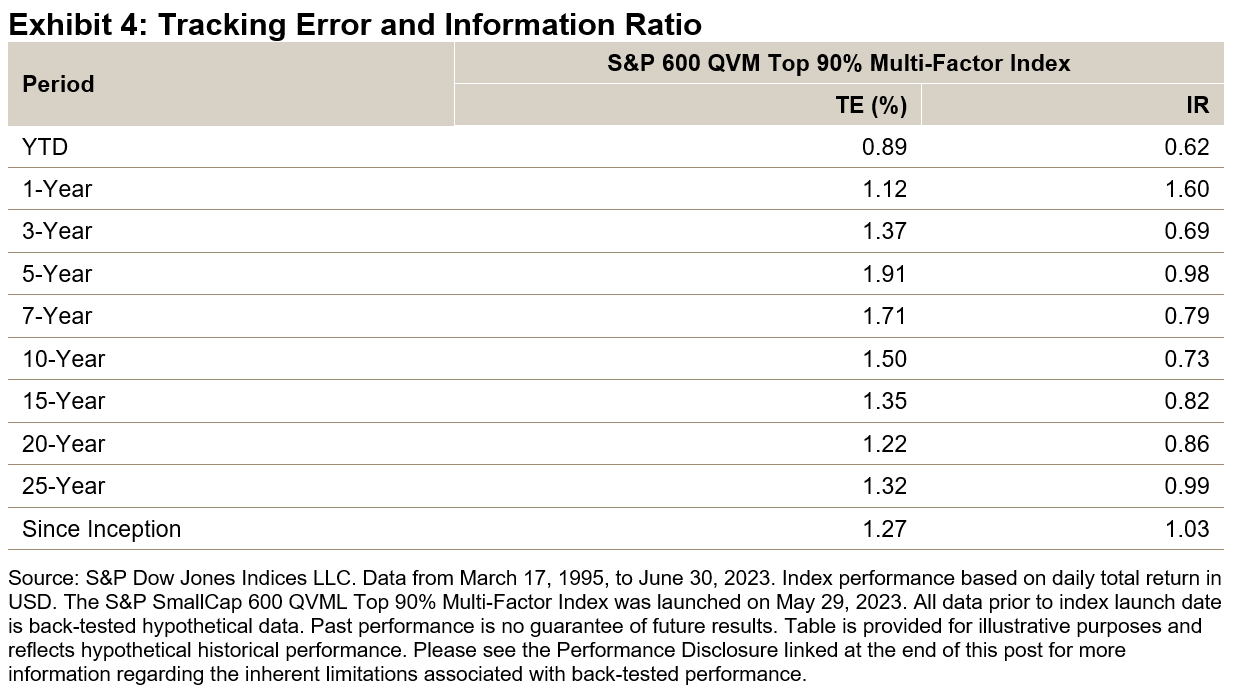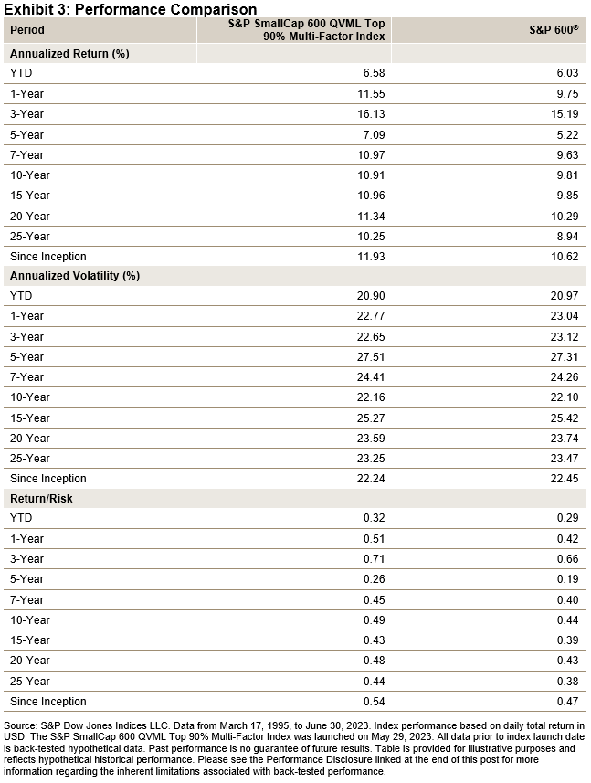 Over more than 20 years of live history, the S&P 500® Equal Weight Index has outperformed the S&P 500 by a substantial margin. Between Dec. 31, 1990, and June 30, 2023, Equal Weight’s compound annual growth rate was 11.82%, well ahead of the cap-weighted S&P 500 at 10.55%. This performance edge is a product of robust underlying characteristics, most importantly a tilt toward smaller-capitalization stocks. Equal Weight’s historical returns have outpaced those of virtually every active large-cap U.S. equity portfolio in our SPIVA® database.