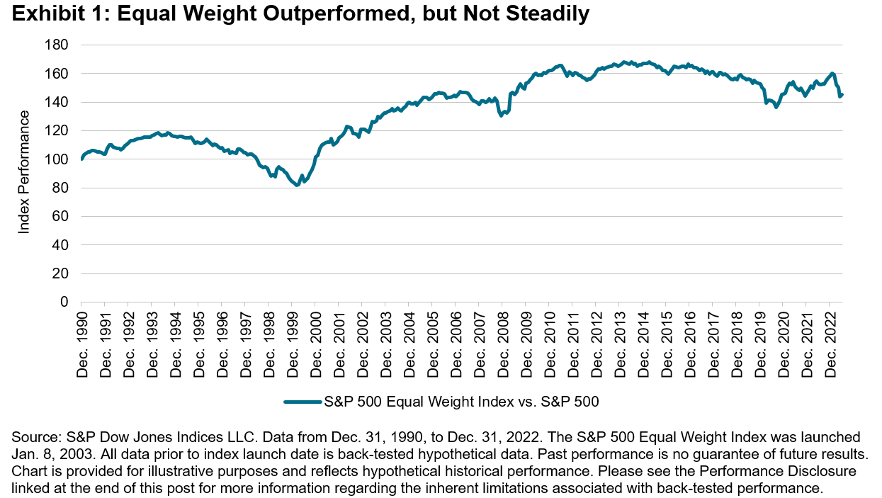 As the exhibit suggests, there can be long periods of both under- and outperformance. For example, Equal Weight lagged for more than five years between August 1994 and February 2000, and then began a six-year run of superior returns.